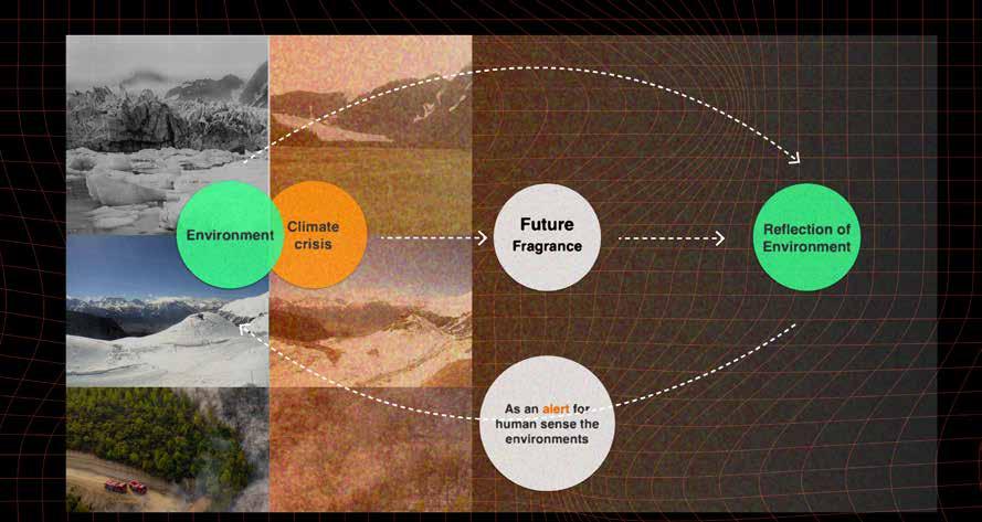 This concept inspired by Firmenich’s (fragrance company) responsibility and sustainability aspect. Fragrance is inspired by nature, and take ingredients from nature;While facing the climate crisis, Future fragrance, Firmenich, reflect on the environments, preserve and promote the natural environments by using the advanced technology/Green chemistry/white biotechnology showing the responsibility to the environment and influence the whole fragrance industry. Thus, fragrances can send a signal or alert to remind people to sense the environments.