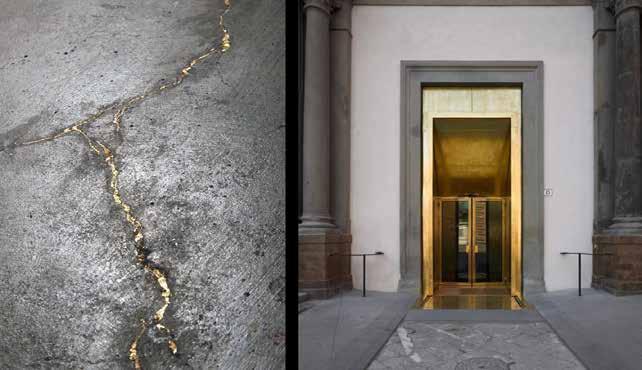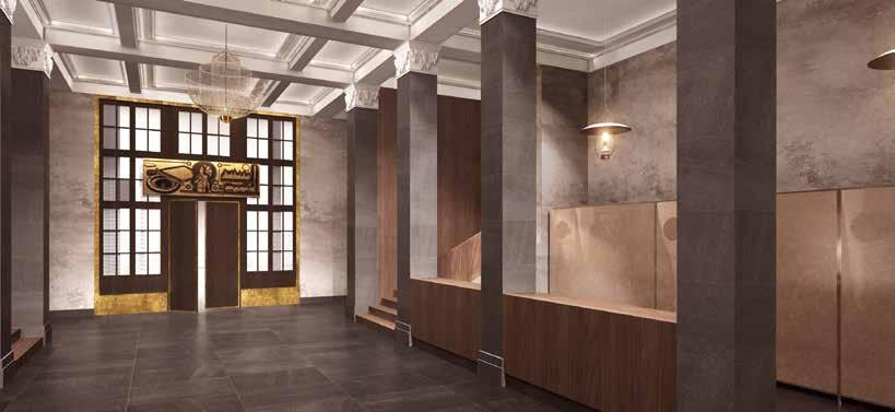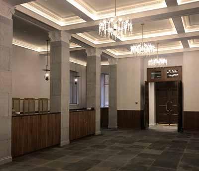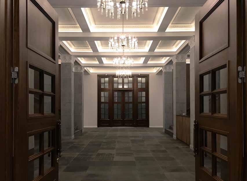 Preserve original door frame, restore wood finishes, replace textured glass, and add gold leaf around the outer frame. Grey flamed granite and brushed granite are used on the floor and the columns. Tribute to Glories 01 Tribute to Glories 01