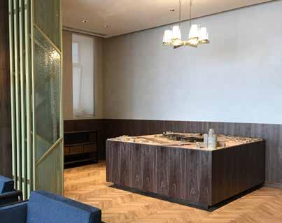 The reception desk is on the right side of the entrance, and clothes and hats storage and catering services are provided. Two groups of waiting areas are set on the left side of the entrance.