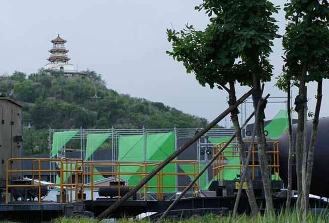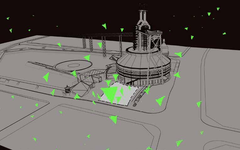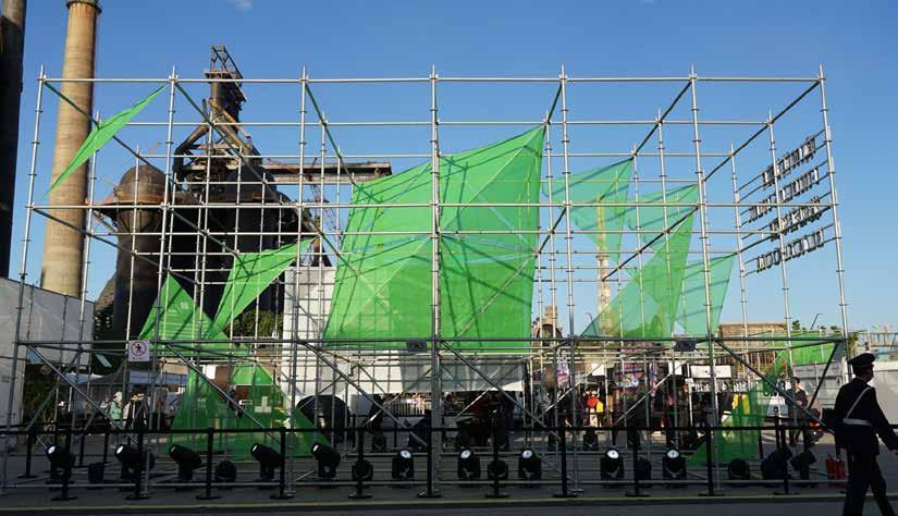 21 20 Communication Refinement Iron ore Hot Iron Liquid Steel Products Limestone Coal Fuse Reuse Converter Casting Blast Furnace Gathering Renovation CONCEPT The site of the event is the square in front of the No. 3 Blast Furnace, which is the first step of steel-making: fuse, refine and reuse the original mineral materials. A green diamond-like energy block is formed by a single triangle unit which is the most stable structure signify the steel industry as the pillar industry in China. This installation expressed the rebirth of this century-old Shougang and the revitalization of this abandoned site. Fusing 02 Fusing 02 VISUALIZATION