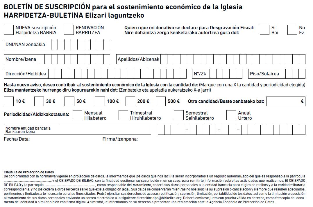 De conformidad con la normativa vigente en materia de Protección de Datos de Carácter Personal, el suscriptor presta su consentimiento expreso para la incorporación de sus datos a los ficheros, automatizados o no, del Arzobispado /Obispado o de la parroquia elegida. Los datos del suscriptor en ningún caso serán cedidos a otras entidades, pudiendo este ejercer los derechos de acceso, rectificación, cancelación y oposición dirigiéndose por escrito al responsable del fichero. Boletín de suscripción adaptado a la normativa Adendos SEPA (zona única de pagos)