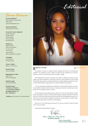 EnestaEdición Editorial Somos Esencia Directora Editorial María Alejandra Pasarella A. CNP 15.084 mpasarella25@gmail.com Asistente Editorial Mariangela Pasarella A. Gerente de Comercialización Ángela Alvarado (0414) 0999186 (0416) 4924928 (0242) 9383349 (0285) 6340776 Redactores Rafael Casique Willyeni Hernández Krisaura Vital Ilich Oviedo Jenny Araque María Alejandra Pasarella A. Fotografía Clement Díaz Orlando Gómez Asesor Jurídico Abog. Luis Pasarella Diseño Gráfico Jesús Golindano Diagramación y Estilo Nahir Flores German Delgadillo Depósito Legal PP200802BO3004 Revista Esencia “Viviendo en Positivo”, es un producto editorial de Imagen Bolívar C.A. Rif: J-29644626-1 Teléfonos: (0285) 6340776 y (0424) 9141353