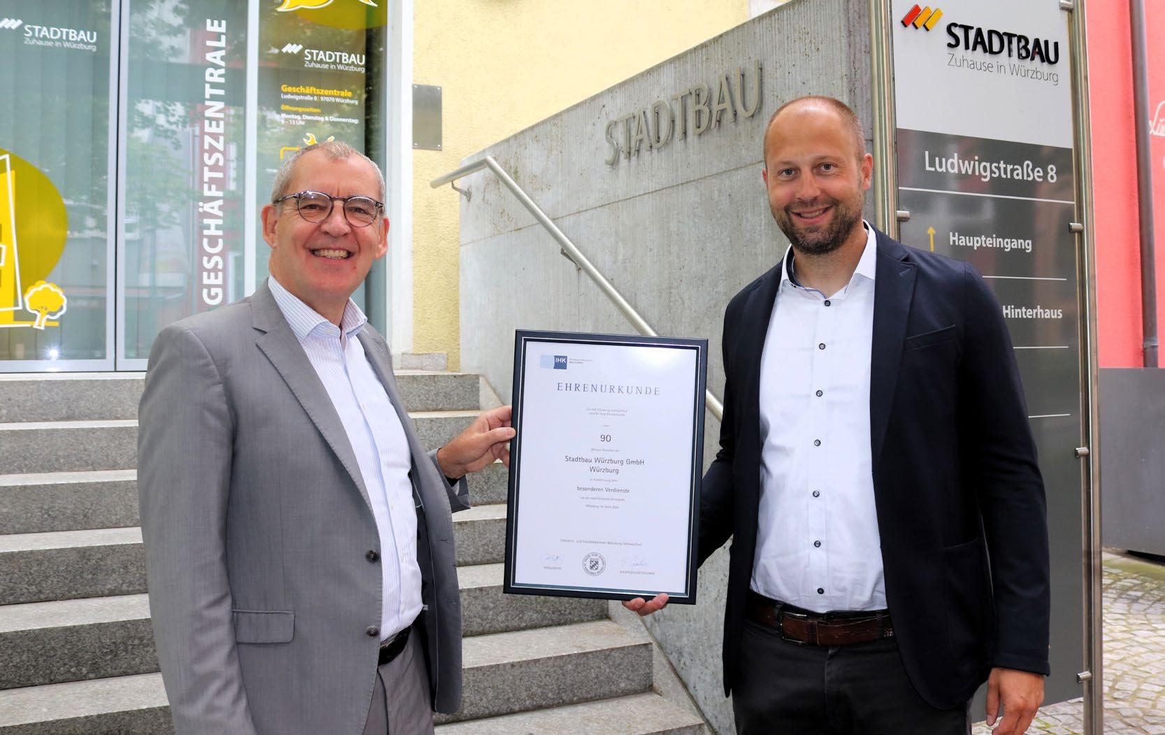 Anlässlich ihres 90-jährigen Bestehens verlieh die Industrie- und Handelskammer der Stadtbau Würzburg GmbH die Ehrenurkunde. Dr. Sascha Genders, Hauptgeschäftsführer der IHK WürzburgSchweinfurt, überbrachte die Glückwünsche zum Firmenjubiläum persönlich an Stadtbau-Geschäftsführer Hans Sartoris. Die Urkunde ist ein Zeichen der Anerkennung der besonderen Verdienste um die mainfränkische Wirtschaft.