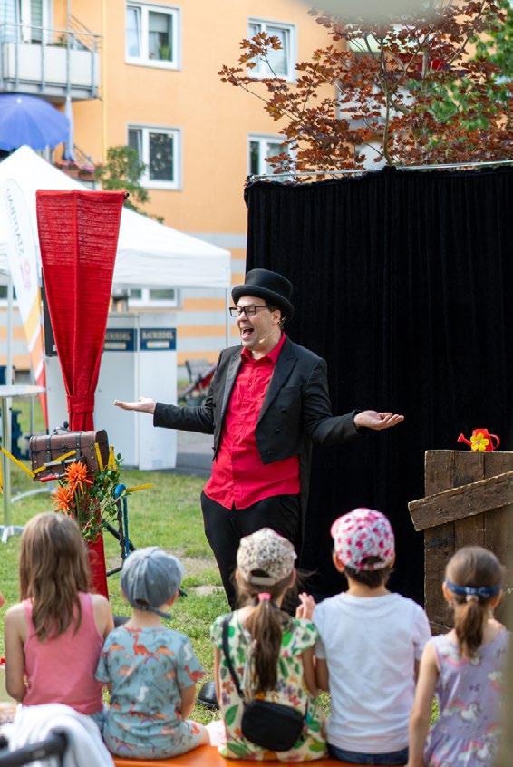 Im Frauenland feierten am Donnerstag, den 27. Juni 2024 die Mieterinnen und Mieter gemeinsam mit den Quartiersbetreuerinnen Annalena Lehrieder und Lisa Weigert 90 Jahre Stadtbau Würzburg. Im Innenhof der Frauenlandstraße 2 und Franz-Schubert-Straße 10 verzauberte der Magier Ju Vega die Mieterschaft mit beeindruckenden Tricks.
