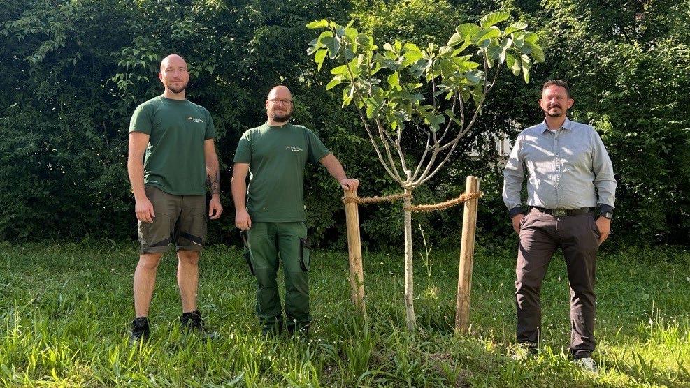 Landschaftsgärtner Max Bohlig, Matthias Schrott und Freiflächenmanager Kai König freuen sich über die Neupflanzungen und den Baumbestand (v.l.n.r.).