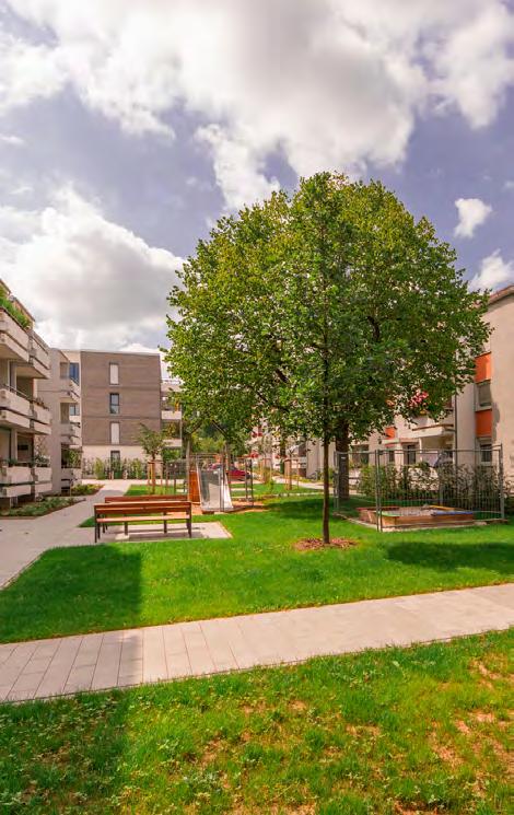 Grüne Oasen und Gemeinschaftsflächen schaffen ein nachhaltiges Wohnumfeld zum Wohlfühlen mit schattigen Plätzen im Sommer.