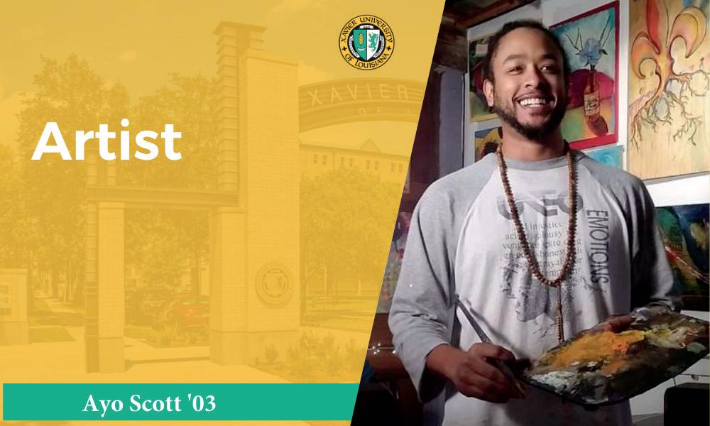Before his name was included among the great artists of New Orleans, Ayo Scott, ‘03, was on a very different path. He began his academic career at Xavier as a biology pre-med major, then explored different majors and passions before finding his gifts in art and graphic design. He continues to honor his heritage and the bearers of a rich culture through his exhibition “Holding On: Reaching Forward, Selected Works by Ayo Scott,” which was displayed on campus last fall.