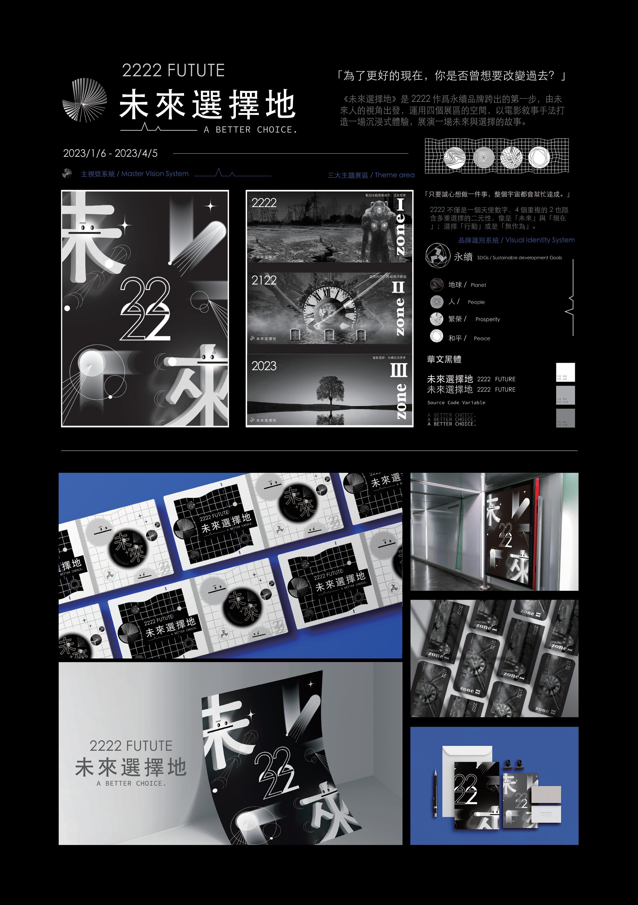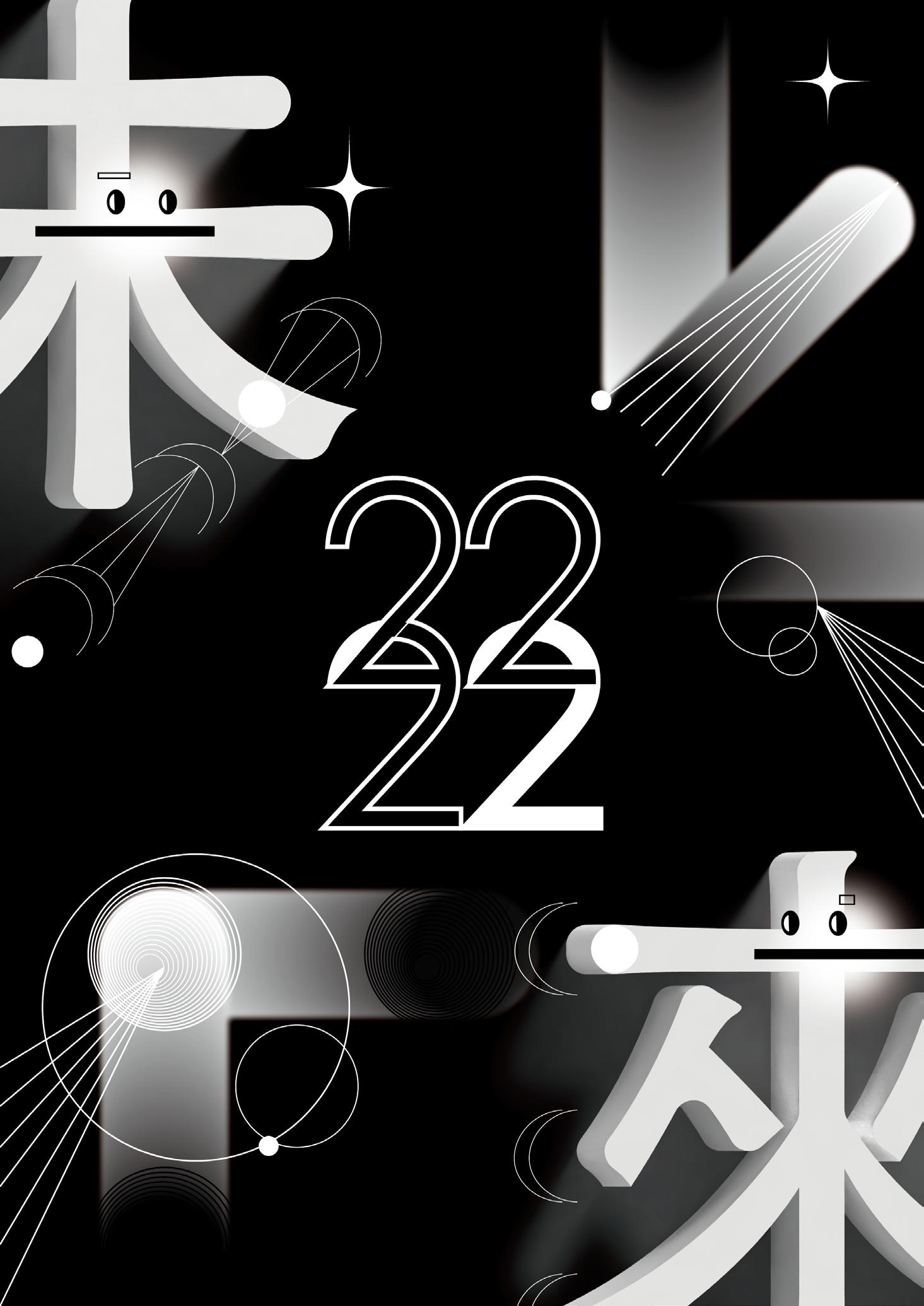 畫面中間的四個2彼此交疊,代表著未來是許多個現在互相重疊交錯編織而成的, 而左上與右下角的「未來」兩字,彼此相互對視著,挑起單邊眉毛的表情似乎是 在做出選擇,也代表著對於未來的選擇是需要經過重重的思考、猜疑與推測的, 甚至在做出了選擇後,還是會時不時望向另一個答案,抱著其他對於未來的想像。 另外,我運用了許多幾何圖形,代表著許多的含義,放射狀而逐漸模糊的長條形, 表示著未來是向四面八方開展發射出的,不斷放大而彼此交疊的圓,代表著未來 是沒有盡頭的放大、推演而不停止的,而其中相連的月亮符號,代表著宇宙的運 轉,希望停留在現在、過去、抑或是去到未來,在多重的宇宙間彼此穿梭著,只 為了選擇出更好的未來。
