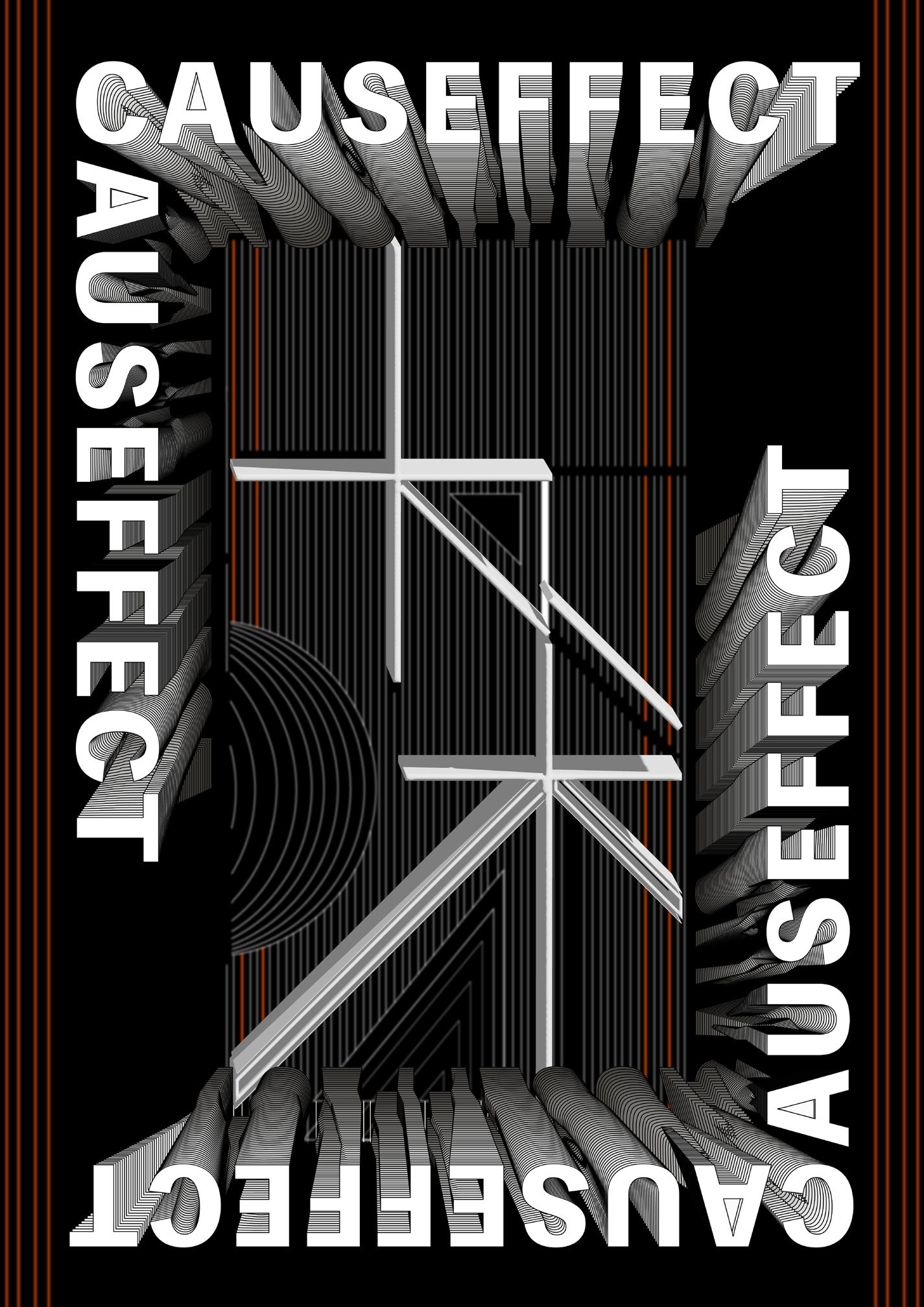 數學上射線的定義為以一端點為起點,沿著另一端點無限延伸的線,與「因果」 有異曲同工之妙,我將「因」比擬為「起點」,而「果」為另一端無限延伸的 線,許多人會將因果比擬為無限符號表其循環輪迴著,而我認為「因果」是種 瓜得瓜,種豆得豆的概念,因為一個「起因」會導致不斷延伸而沒有盡頭的「結 果」,每一個決定與行為都會發展出不斷延伸的未來,而每個「因」彼此交織, 就會產生出多變而無止盡的「果」。此設計的背景選用黑色表達無盡、未知的 空間,畫面中運用大量的直線傳達每段關係與事件的相連相織,而重複疊加的 cause&effect 則代表著因果關係是不斷疊加且向外延伸的,而畫面中的紅線代 表著關係彼此相織譜出如同射線的「緣」。另外,畫面中央左上與右下相連「因 果」兩字,傳達著前因後果的概念,刻意缺少的筆畫,展現出因果關係不完美的 特性。