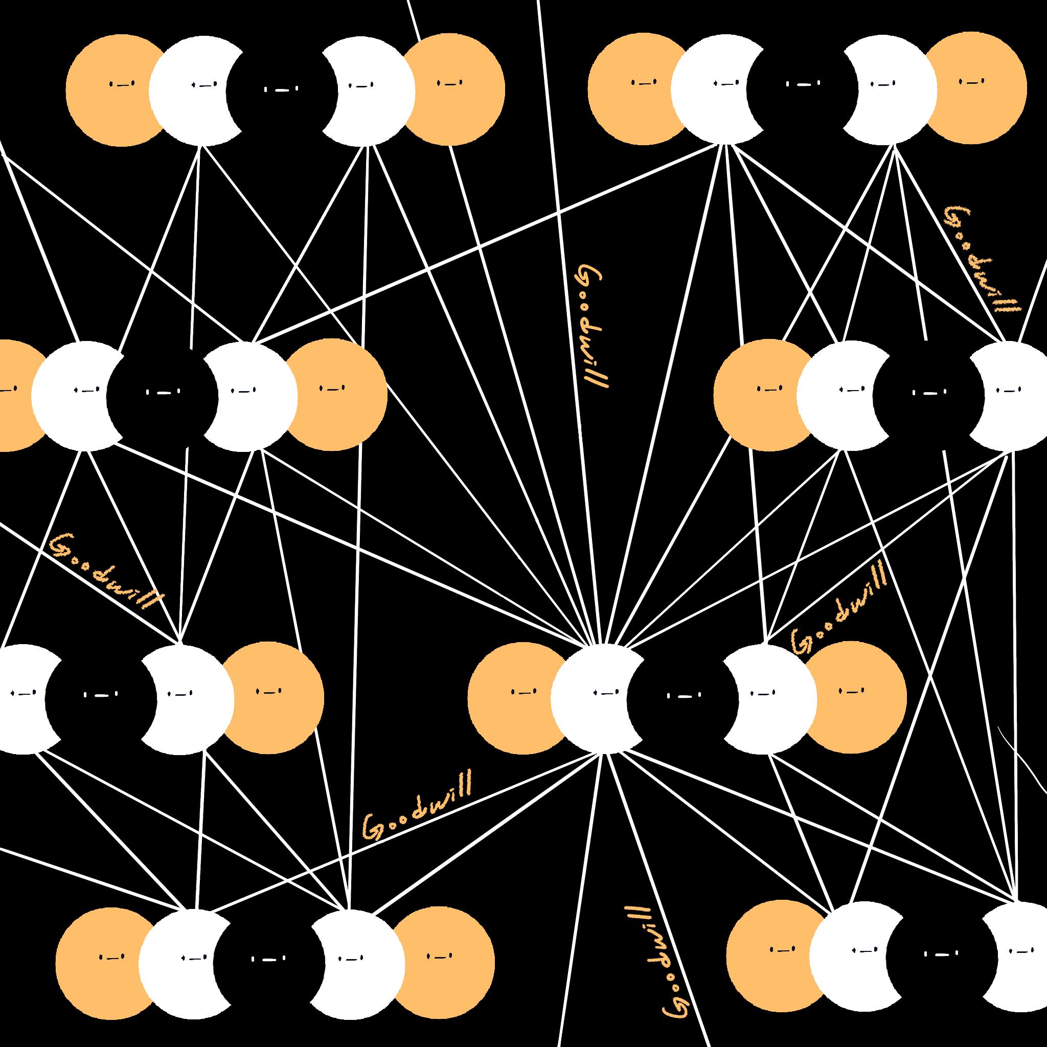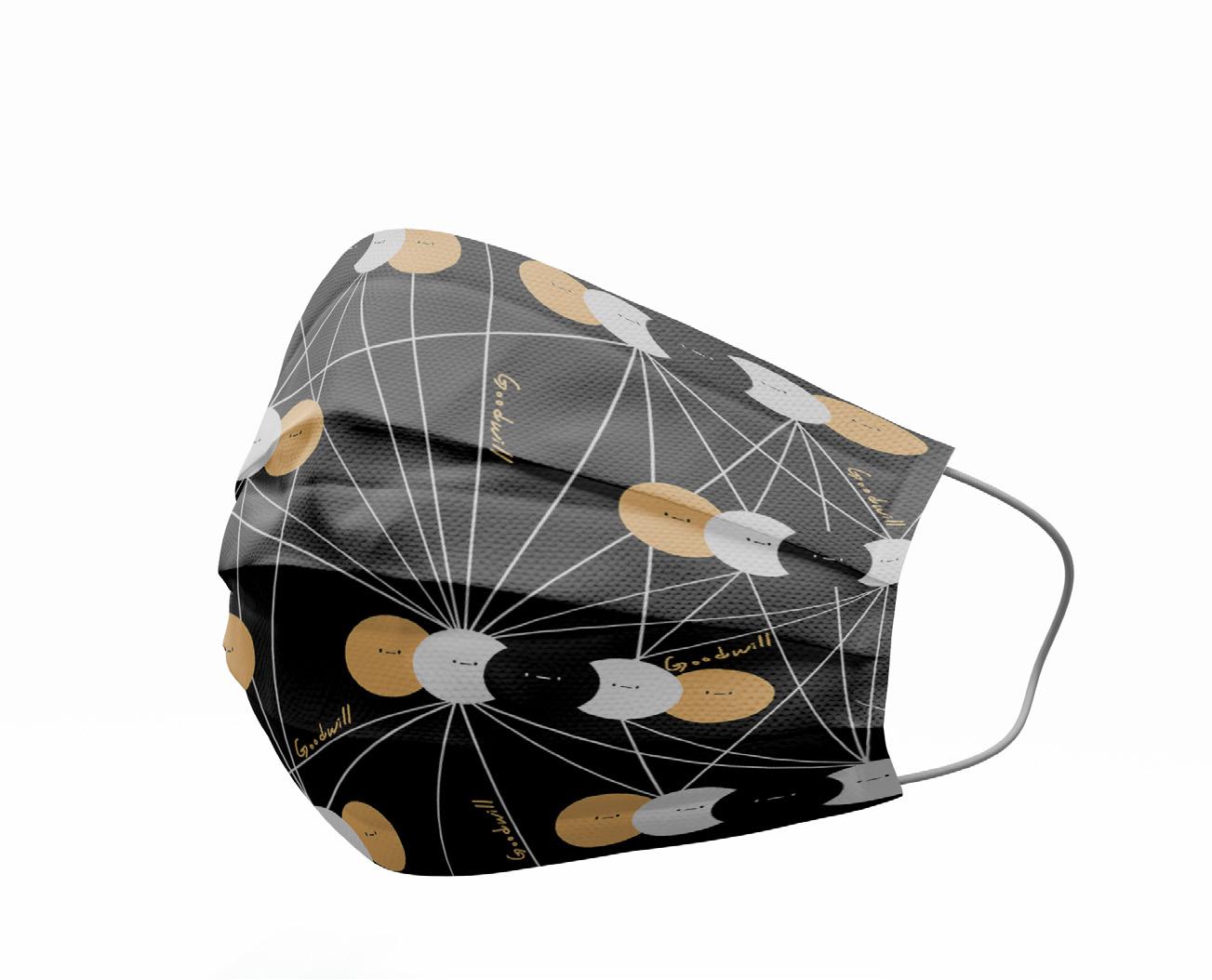 口罩存在的意義不再只是「隔離」病菌和人 與人之間的距離,另外賦予的價值為「連結」 社會之中的善,「以善出發、以善為念」。 此作品運用點與線的對話,展現「善」的精 神,互相依偎的球體透過交織的線相互聯繫, 意謂「善」將人心連結並影響擴散至整個社 會,選用黑色為底色與橘色作對比,表達善 是與惡相對的,此作品中黑色代表惡,橘色 代表善念,而白色則為善對外的展現,將黑 暗包覆,使「橘色善念」蔓延至社會的每個 角落。