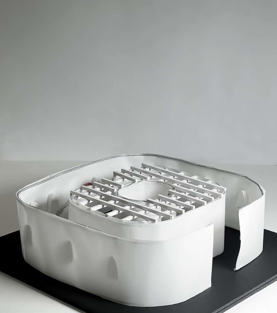 The continuous garment study inspired an architectural strategy where seams become spatial joints, and fabric behavior translates into construction techniques.