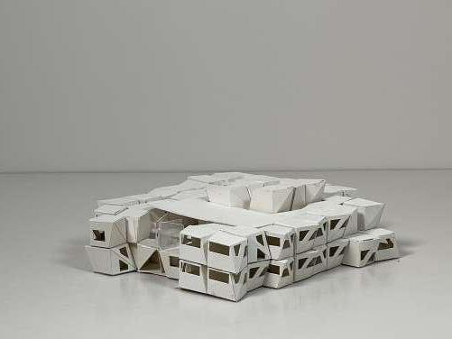 The design of the fashion school translates the downward-folded nature of fabric into a dynamic architectural system, where the act of pleating and layering generates both structure and program. The entire building is organized around this logic, with three floors that emerge through a series of slanted, interwoven planes. These folds define circulation, workspace, and display areas, creating a seamless interaction between learning, making, and showcasing.