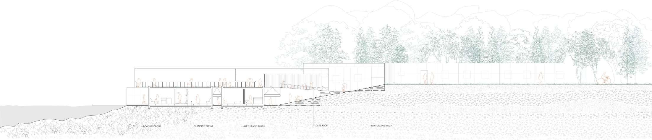The interplay between solid earth-cut spaces and lightweight mesh enclosures reinforces the connection between body, material, and movement, making architecture an active part of the recovery process.