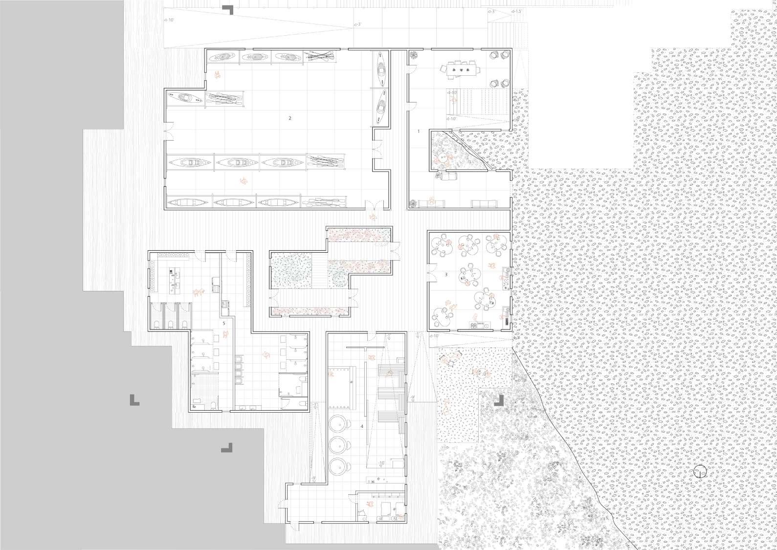 Each programmatic element is carefully positioned within the three-story structure. The basement level houses bathing and locker areas, providing a private space for reflection and preparation.