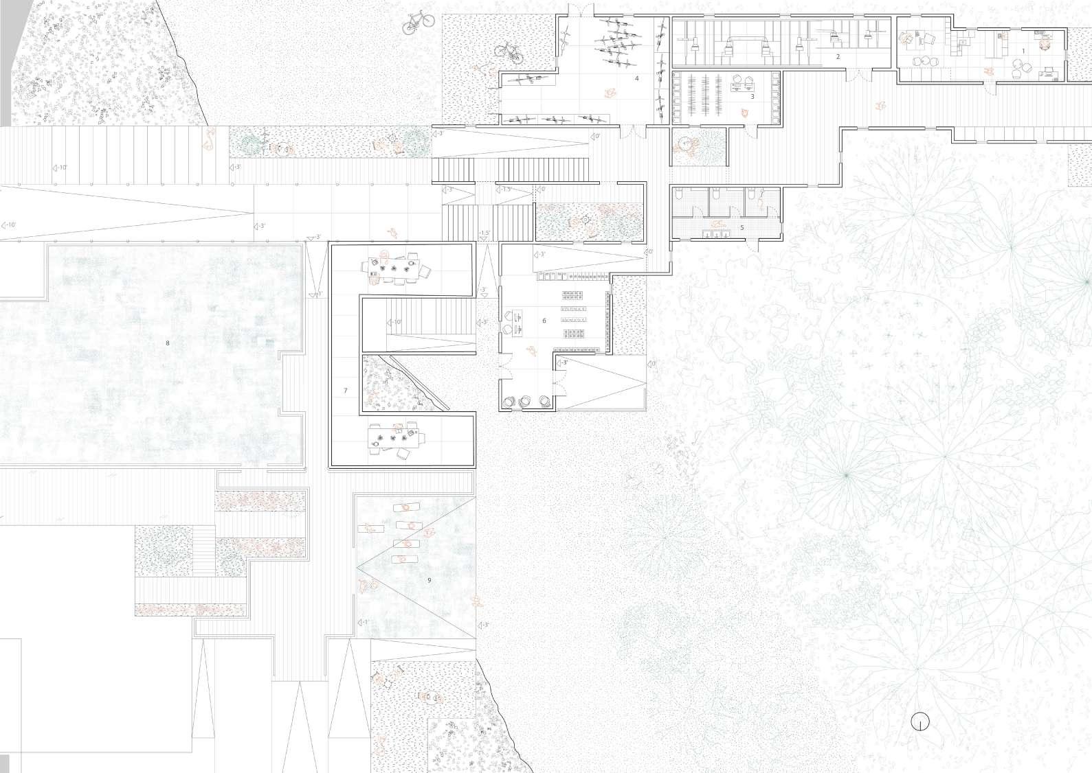 The circulation strategy is central to the patient experience, orchestrating a journey of renewal. A system of ramps leads patients downward, where they cleanse and prepare in the basement-level bathrooms and lockers. From there, they ascend through the building, moving upward to receive their prosthetics, symbolizing progress and empowerment. This spatial narrative turns movement itself into a healing ritual, reinforcing the transformative nature of the clinic.