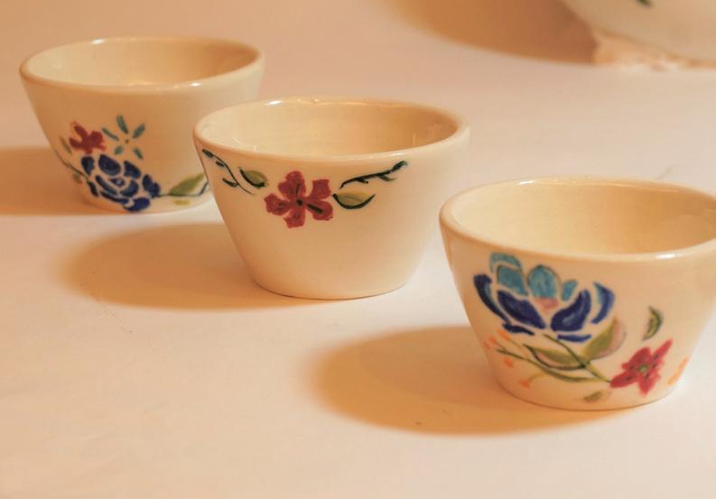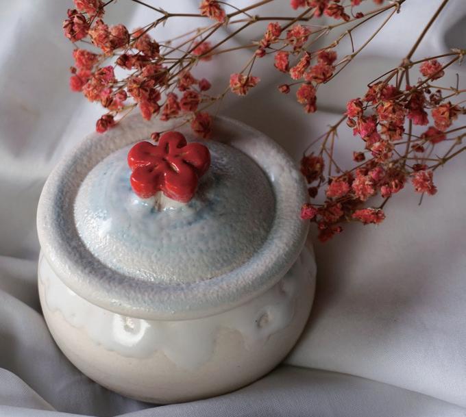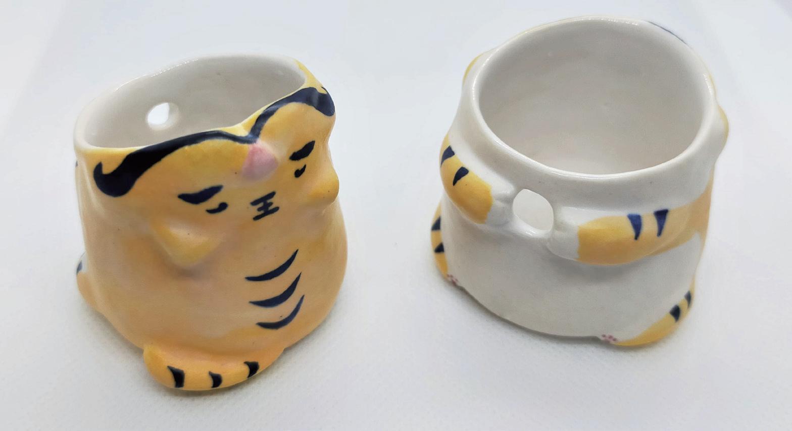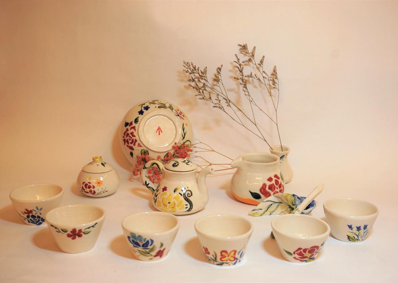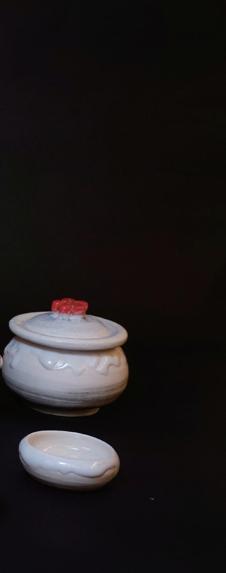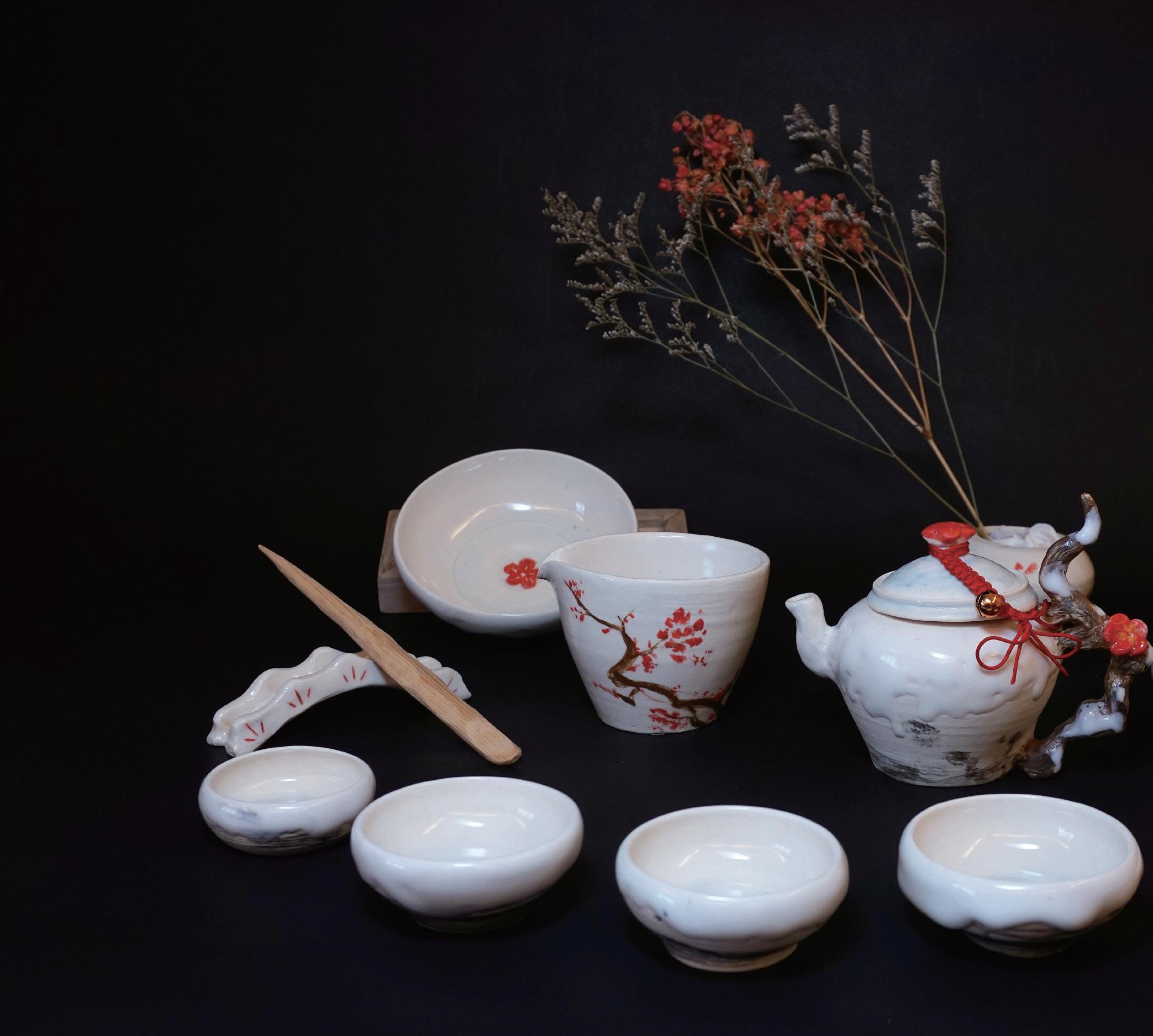 雪球融融的外型,壺杯都融化流動的造型 杯內壺蓋上梅花的意象,墨痕足跡。