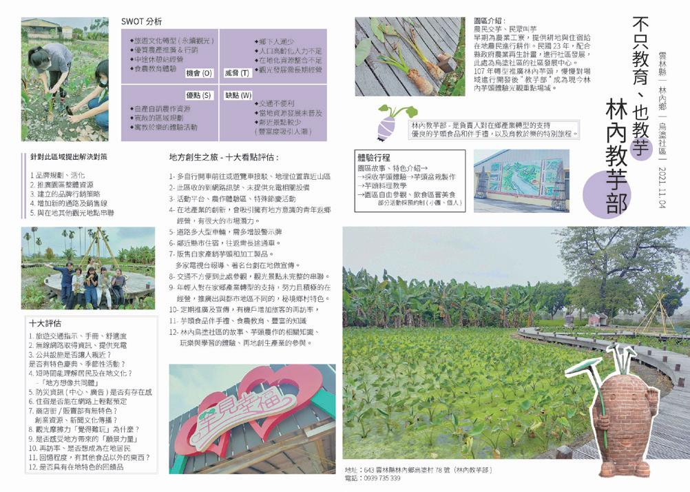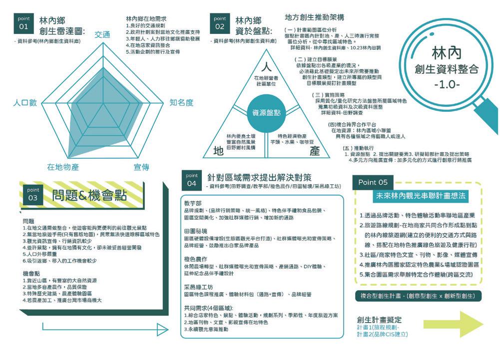 地訪 查 與分析,進行地方創生品 牌再造與設計。加強區域規劃與 連結,推廣在地農產及觀光資源, 提升林內地區永續發展。