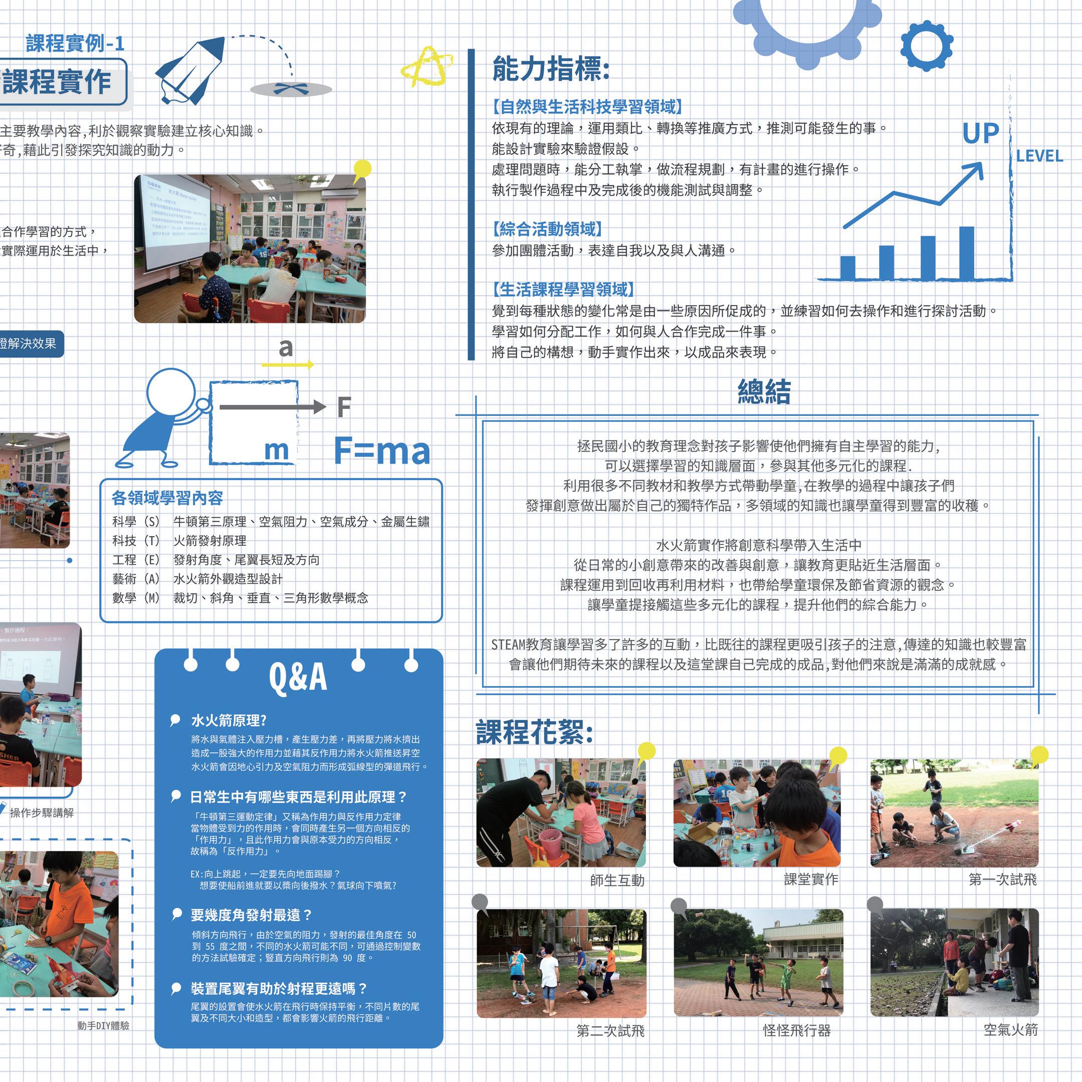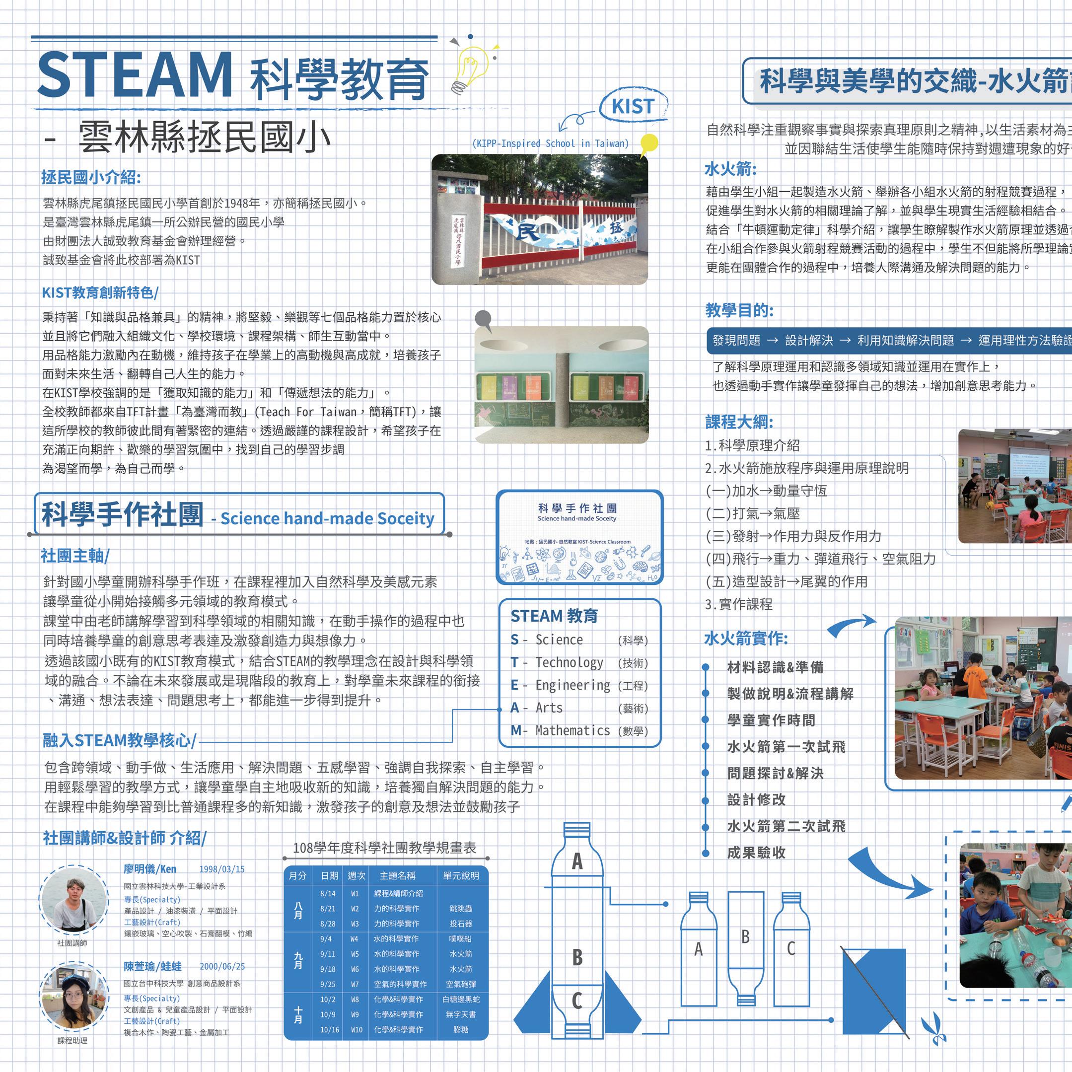 針對國小學童開辦科學手作班,在課程裡加入自然科學及美感元素, 讓學童從小開始接觸多元領域的教育模式。課堂中由老師講解學習 到科學領域的相關知識,在動手操作的過程中也同時培養學童的創 意思考表達及激發創造力與想像力。透過該國小的KIPP教育模式, 結合STEAM教學理念在設計與科學領域的融合在未來發展或是現 階段的教育上,對學童未來課程的銜接、溝通、想法表達、問題思考上, 都能進一步得到提升。