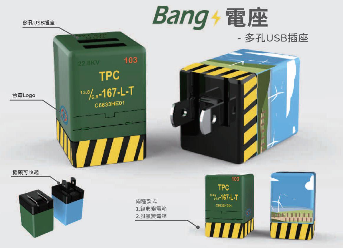 以變電箱的外型發想,可以插多 條充電線,解決現代人電子產品 充電插座的困擾。加入台電的意 象,使用時如同變電箱供電給你 充電,增添生活的小趣味。