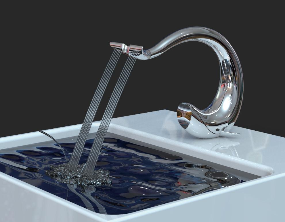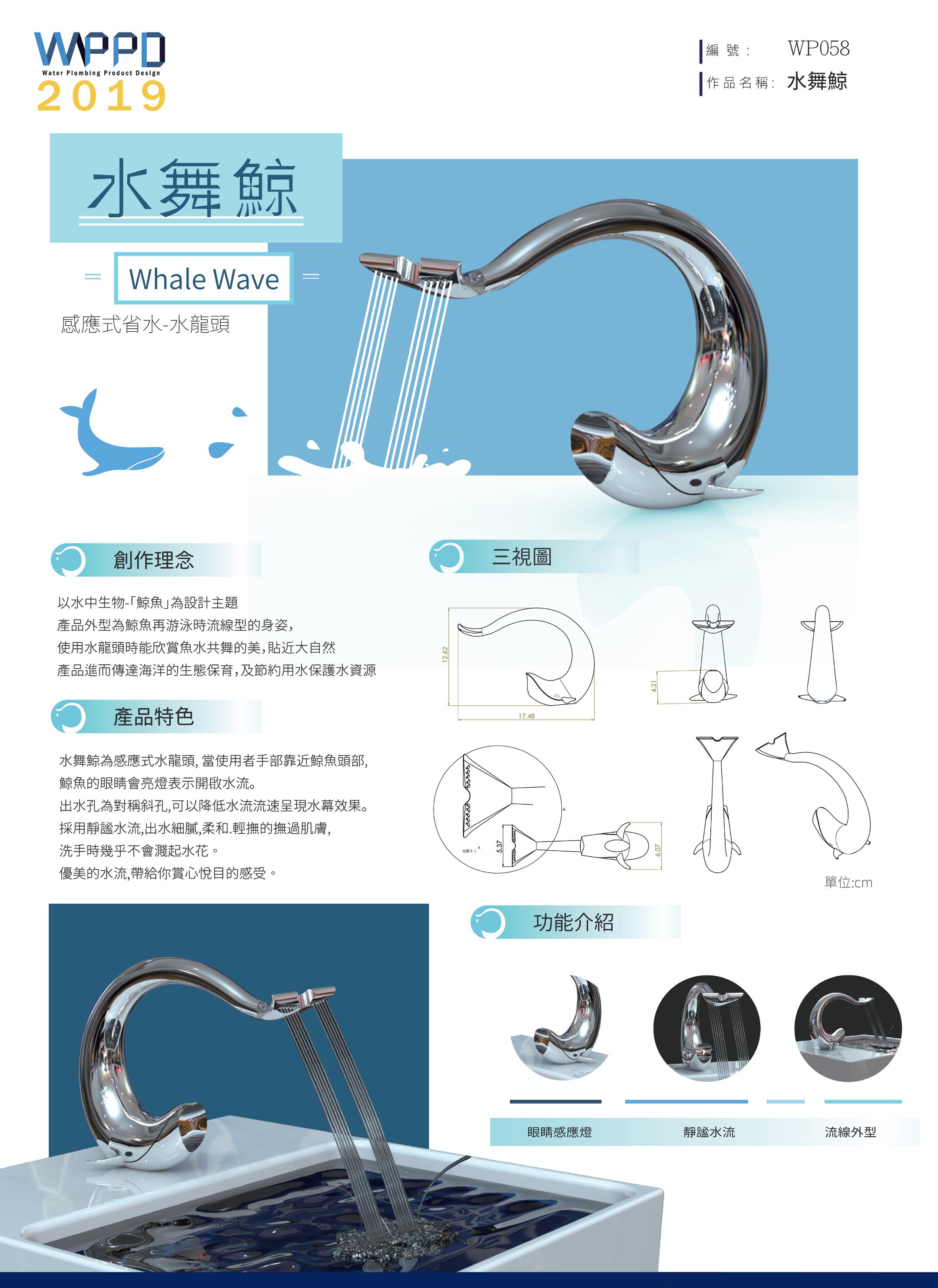 水中生物-「鯨魚」為設計主題 產品外型為鯨魚游泳時流線型 的身姿,以及躍出水面拍打浪 花的水流效果,讓使用者在使 用水龍頭時能欣賞魚水共舞的 美,貼近大自然。