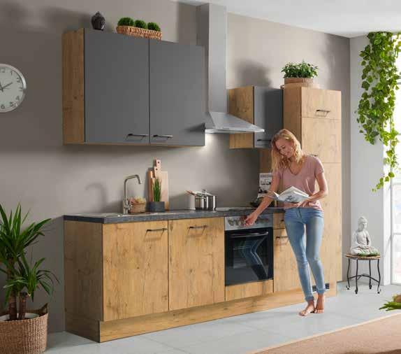 Kuhinjski blok brez aparatov, širine 280 cm, v kombinaciji grafitne barve in hrasta. Izdelan v Nemčiji, opremljen s sistemom mehko in tiho zapiranje vrat. Brez električnih aparatov – idealna osnova za vašo sanjsko kuhinjo. (14970024/6Z)