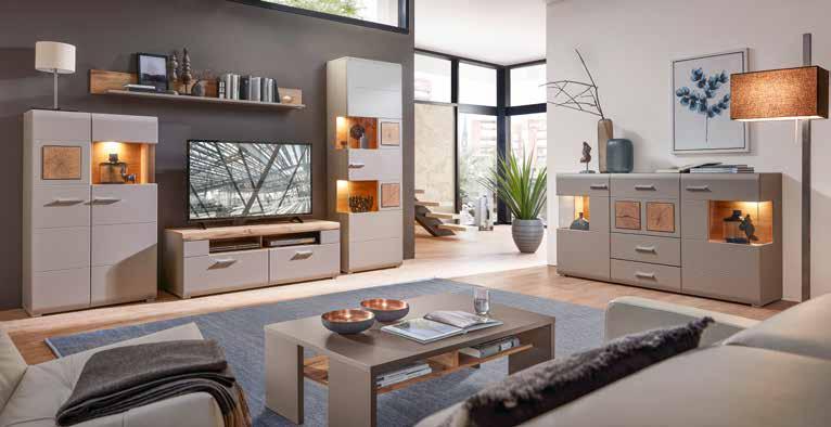 Dnevni regal, dim. 325 X 205 X 47 cm, mediapan, barva: basalt, vstavek: zrnat les. Vključno z LED-osvetlitvijo. Klubska miza, dim. 110 X 40 X 65 cm: 179,- 139,- Komoda, dim. 170 X 94 x 42 cm: 629,- 490,- (27370380/01-03)
