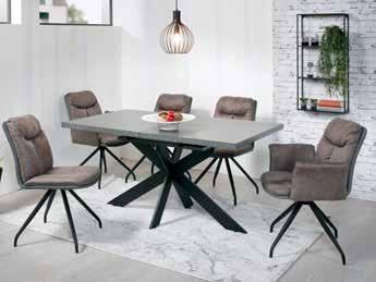 Jedilna miza, dim. 180–260 X 76 X 95 cm, raztegljiva keramična mizna plošča, mat črno ogrodje: 1.190,- 799,- Naslanjač, vrtljiv, blago bež, rjave, zelene in sive barve, črno ogrodje, prašen premaz. 149,- 99,90 (00690041/01;07580206/02-04)