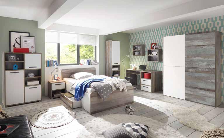 Mladinska soba , barva: driftwood/bela. Možnost nakupa po elementih. Vzmetnica in pod za doplačilo. Drsna omara, dim. 170 X 195 X 62 cm: 349,- 249,-. 1-delni regal, dim. 49 X 201 X 46 cm: 349,- 239,-. Postelja, dim. 140 X 200 cm: 349,- 249,-. Nočna omarica, dim. 49 X 52 X 41 cm: 95,90 69,90. Pisalna miza, dim. 125 X 75 X70 cm: 329,239,-. Visoka komoda, dim. 95 X 146 X 46 cm: 349,- 249,-. Regal, 2 odprtini, dim. 49 X 49 X 25 cm: 79,90 57,90 (02410010/09,02-06,10-11)