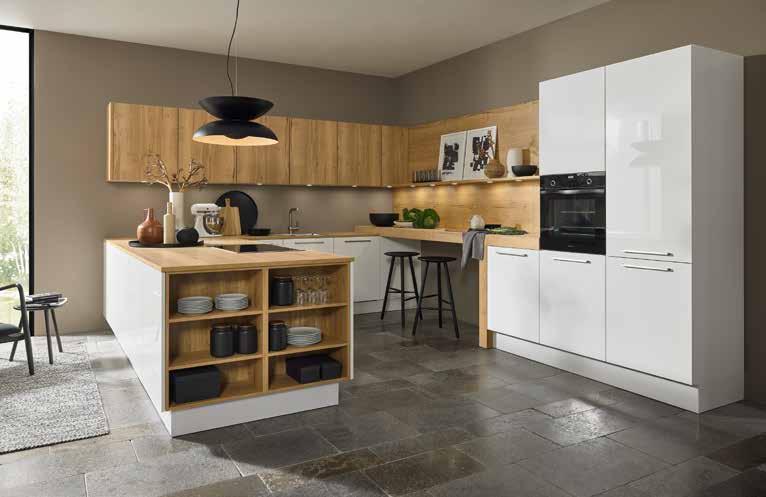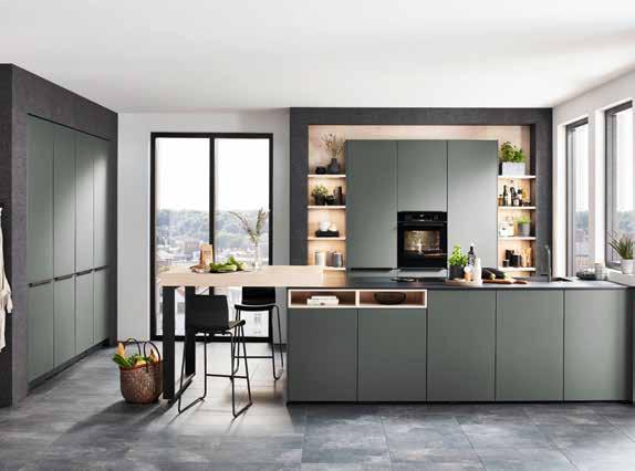 Kuhinja po meri je sanjska kuhinja, ki ponuja veliko prostora in se ponaša z minimalističnim dizajnom. Mineralno zelena kuhinji doda pridih narave, ki ga zaokrožijo elementi svetlega hrasta in črne delovne plošče Tudi barvno usklajena kuhinjska armatura dopolnjuje njen videz (04531294/99)