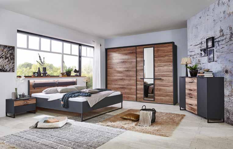 Spalnica , barva: hrast/grafit. Možnost naročanja različnih dimenzij omar in komod. Vzmetnica, pod in venec za doplačilo. Omara z drsnimi vrati in ogledalom, dim. 300