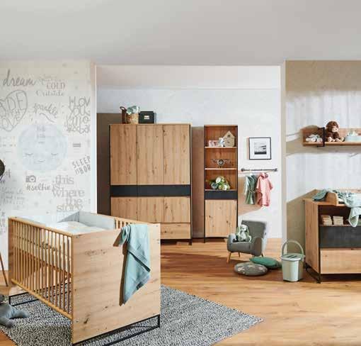 2. Otroška sobica „YUNAI“, les - hrast, jeklo, v antracit - hrast barvni kombinaciji. Otroška posteljica, 70 X 140 cm, nastavljiva po višini, možna predelava v mladinsko posteljo. Previjalna komoda, 120 X 106 X 77,8 cm, vključno z nastavkom za previjanje. Garderobna omara za dojenčka, 140 X 209 X 55 cm. (02410046/01-03)