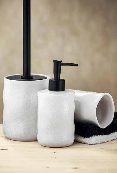 1: Serija kopalniških pripomočkov „CRINKLE“, 100 % umetna masa, bele barve. Lonček za zobne ščetke, 8 X 10 cm. Dozirnik, 8 X 17 cm. WC-garnitura s ščetko, 8 X 17 cm. (33422007/21,41,61)