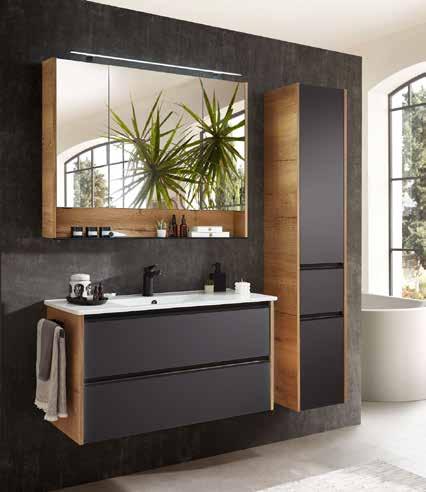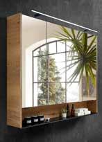 Kopalnica , korpus grafit, leseni dekor, fronta bela, visoki sijaj. Vključno z mehkim zapiranjem vrat. Cena za osnovni sestav: viseča omarica, dim. 90 cm, s tremi ogledali in vgrajeno svetilko, stikalom ter vtičnico + spodnja omarica s keramičnim umivalnikom, dim. 92 cm. Stranske omarice za doplačilo. (19770266/01)