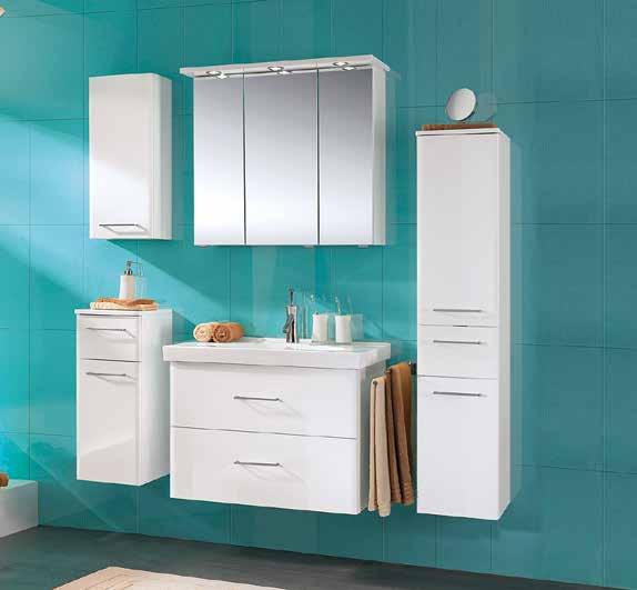 Kopalnica , v barvi bela sijaj s kromiranimi ročaji. Osnovni sestav: spodnja omarica s keramičnim umivalnikom, dim. 83 X 55 X 45 cm, zgornja omarica z ogledali in LEDosvetlitvijo, dim. 75 X 72 X 20 cm. Mehko zapiranje vrat. Armatura, dodatki in stranske omarice za doplačilo.