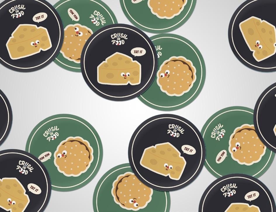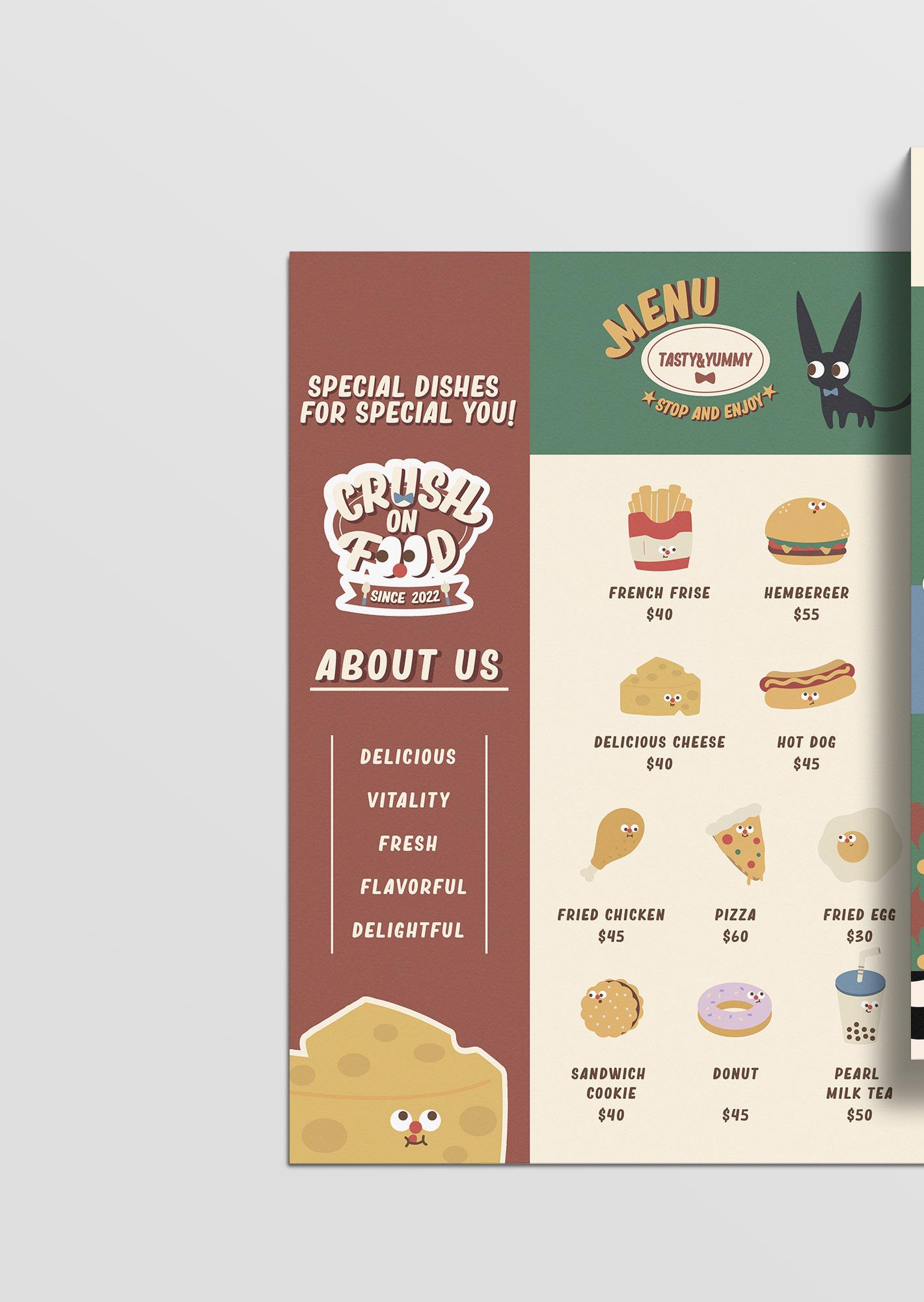 設計特色是所有角色圓滾滾的眼睛,代表讓人怦然 心動的相遇瞬間。由於我把《CRUSH ON FOOD》的 場景設定為一間美式復古餐廳,整體使用色調都加 了黃色色調,在傳單上也使用許多有年代感的裝飾, 希望能增添美式復古的氣息。