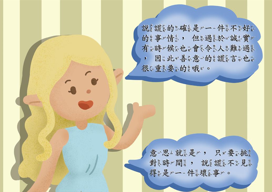教育目的:透過許多人因為謊言的消失而引起各種紛爭,突顯善意的謊言的重要性。 故事內容:很久很久以前,有一個小木偶,他一聽到有人說謊鼻子就會變長,小木偶為了不讓自己的鼻子繼續變長,於是向仙 子許願,讓世界上的謊言消失,沒想到卻發現少了謊言的世界讓人與人之間多了很多磨擦跟衝突…