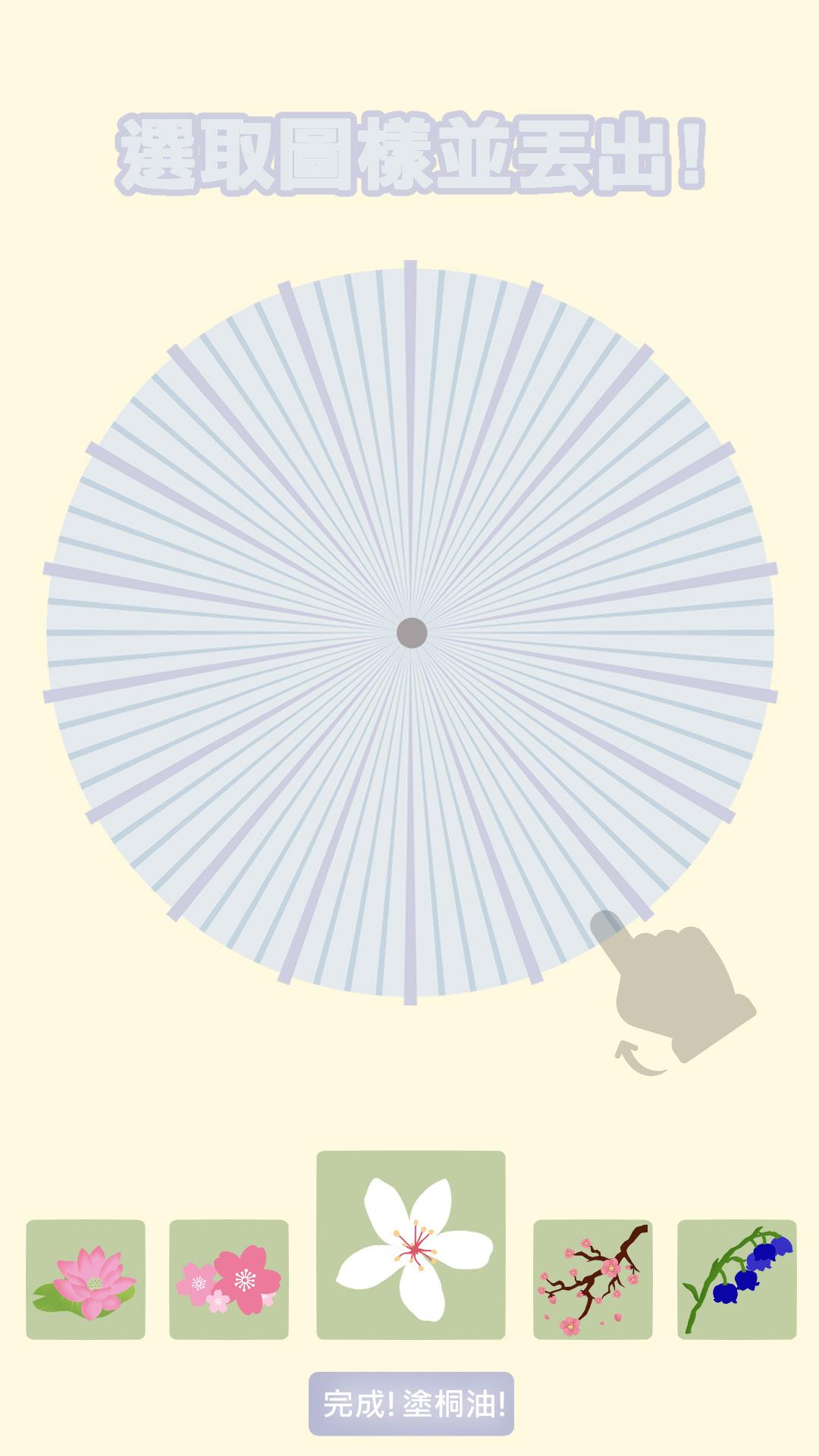 挑選圖樣、瞄準位置並丟出顏料即可幫油紙傘彩繪!