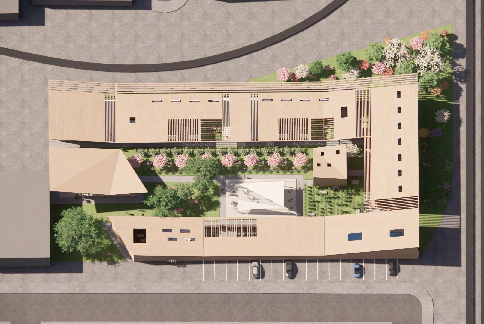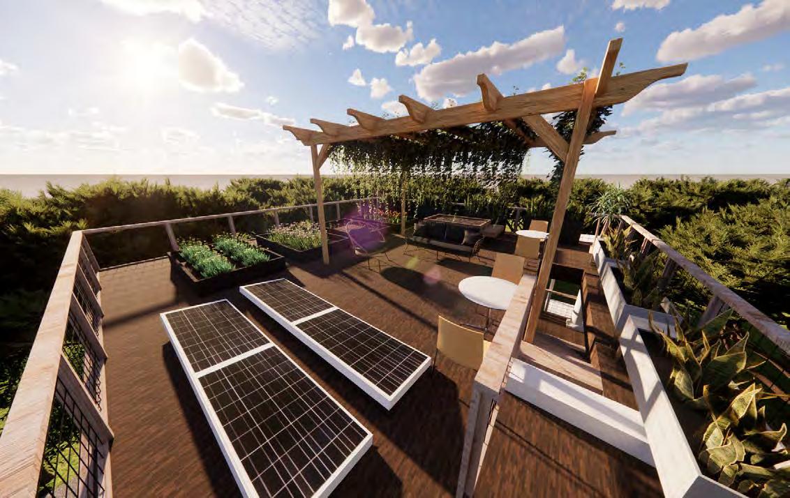 The C.A.R.E. Wellness Center is architecturally designed to foster a healing and nurturing environment, with a layout that supports the center’s holistic approach to wellness. The first floor welcomes visitors with a reception area that sets a serene tone, leading up to a communal dining space on the second floor that encourages social interaction and community bonding. The third floor offers a residential loft for long-term occupants, while a garden rooftop provides a tranquil retreat, emphasizing the center’s commitment to promoting mental and physical well-being through thoughtful, sustainable design.