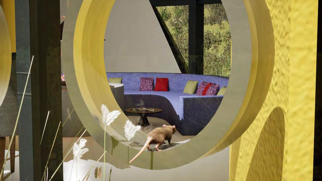 In the animated short “Whiskers and Walls,” a mouse discovers a block of cheese in the Malator House and embarks on an adventurous tour inside. It enters through a chimney, navigates the house’s open, vibrant interior, and after feasting on the cheese, tries to find a resting place. The story climaxes when the mouse is startled by a human and makes a daring escape through a window, highlighting the house’s integration with nature and its unique architectural features.