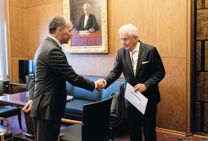 Uusi kansanedustaja Mauri Kontu (kesk.) esitti valtakirjansa puhemies Jussi Halla-aholle eduskunnassa 9. syyskuuta. (Kuva: eduskunta)
