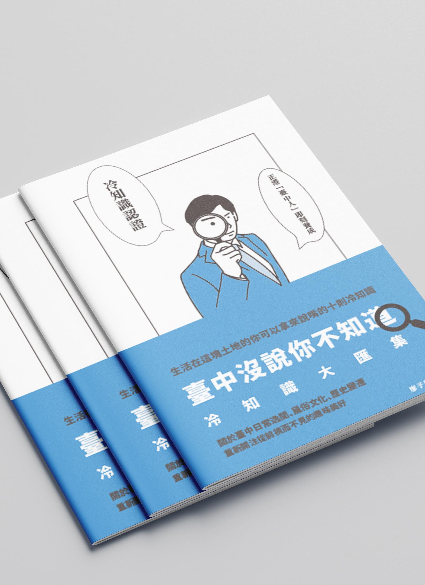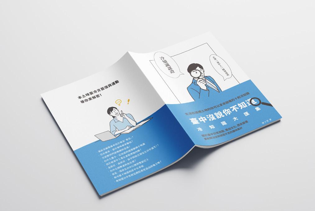 集結十個專屬於台中的趣味 冷知識合集, 透過冷知識深 入了解在地風俗文化。 封面 使用插圖來呈現好奇、 一探 究竟的氛圍, 結合藍色呼