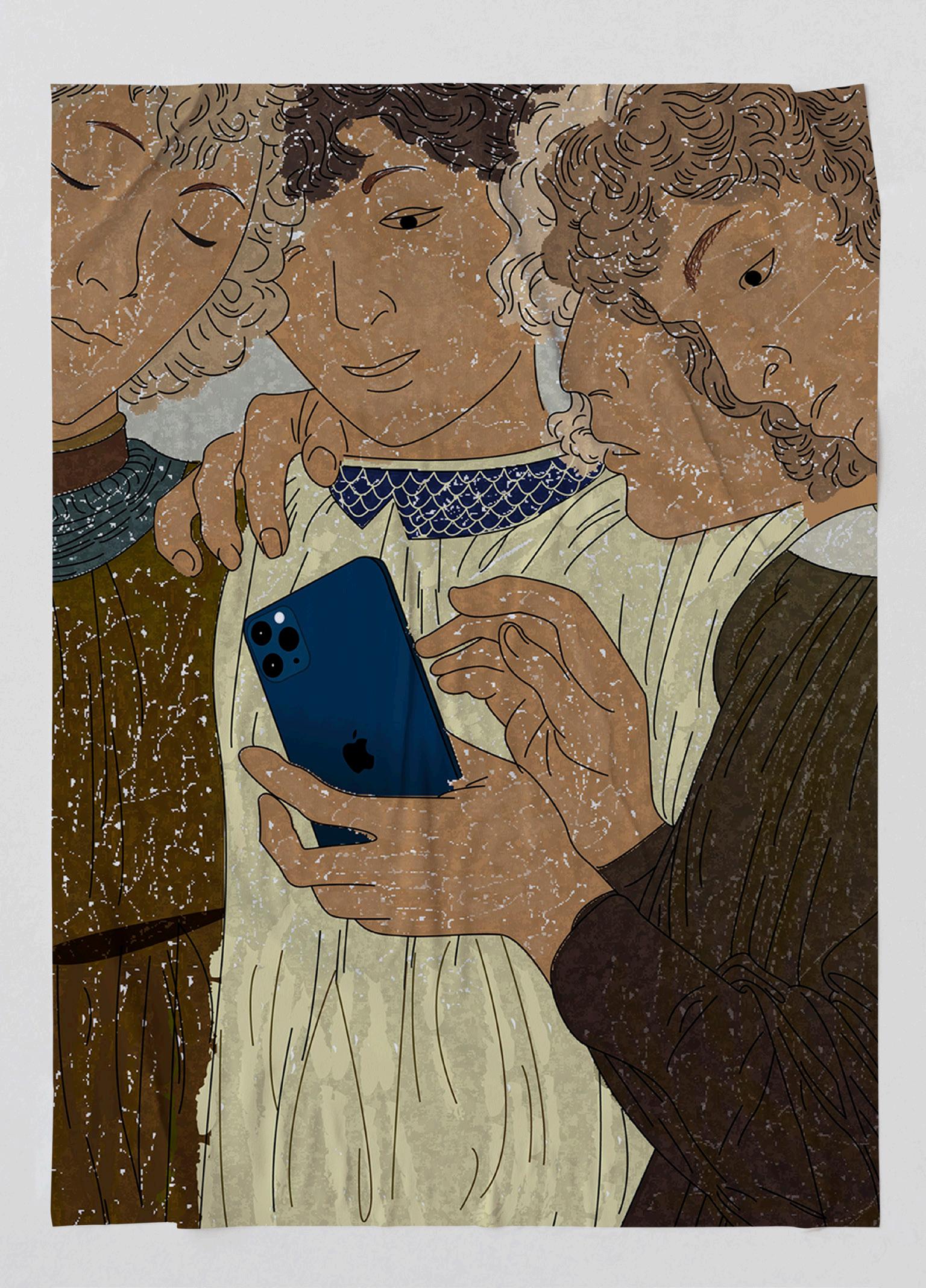 文藝復興中有一個特色是挑戰傳統, 因此將現代的事物( 手 機 ) 融入當中。 圖中古典人物的動作、 表情、 互動與現代事