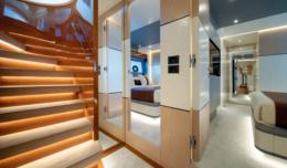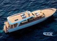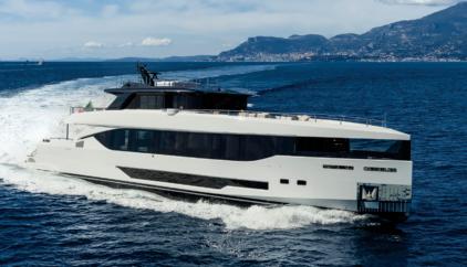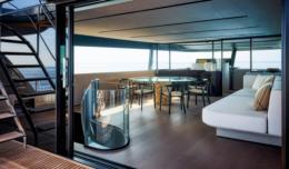 The new flagship of the Triplex line, X130 Triplex, is a masterpiece of generous volumes, harmony, and freedom, designedforthoseseekinganimmersive sea experience in style. Made entirely of aluminium and just under 40 metres long, it combines soft lines and bold geometry true to Extra’s DNA. Interiors by Laura Brocchini Design balance light, material, and movement, while in-house engineering ensures performance and comfort. The mezzanine deck, raised 90 cm above the main deck, is the star feature, offering twin lounges divided by a sculptural fireplaceandoverlookinga60 squaremetersbeachclubwithfold-down platforms. Highlights include elegant Travertine interiors, spacious saloons, a luxurious master suite, and a convivial sundeck with dining, bar, loungers, and an infinity pool. Powered by twin 2,000 hp MAN engines, X130 Triplex reaches 16 knots.