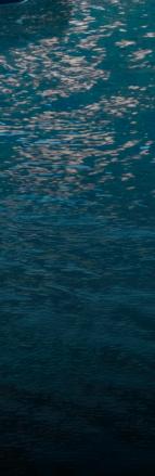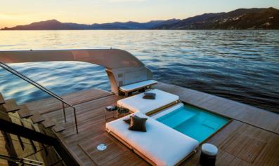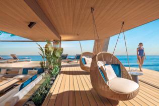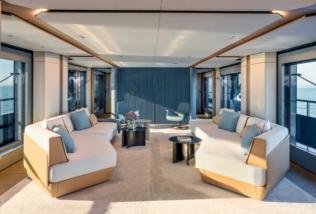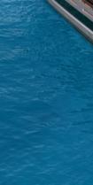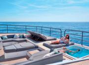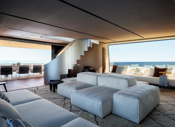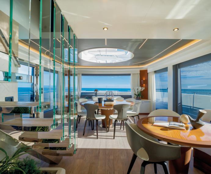 comfort, while social areas include expansive dining zones, intimate upper-deck lounges, and a moon-shaped bar on the bridge deck. Outdoors, a six meters pool and surrounding sunpads grace the main deck aft, complemented by a Jacuzzi and sun lounging areas on the upper deck. The massive beach club transforms the transom into a waterside gallery, accommodating a 7m tender, jetskis, gym,andtoystorage.Withatop speed of 18 knots and 14-knot cruising,the65mExplorerisdesigned for long ocean passages.