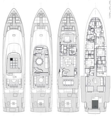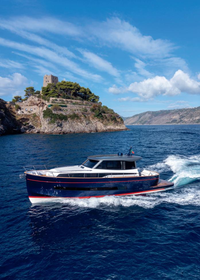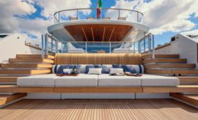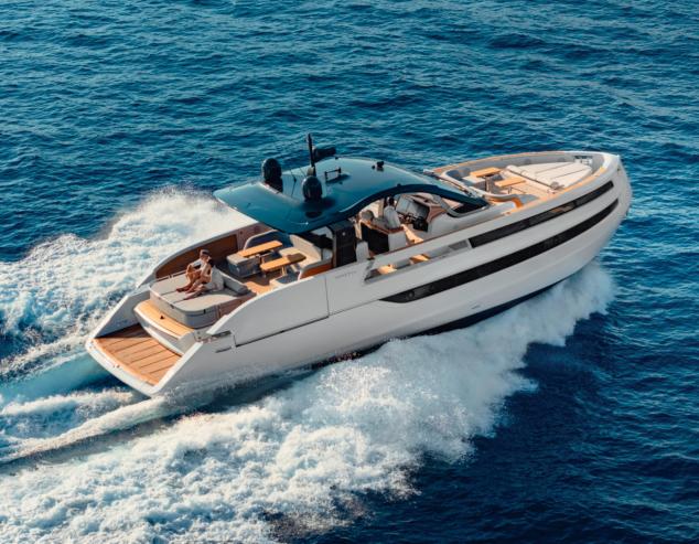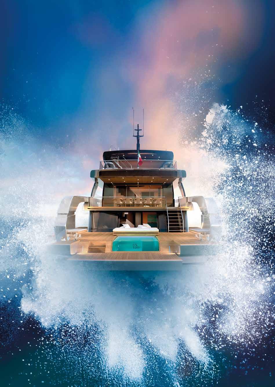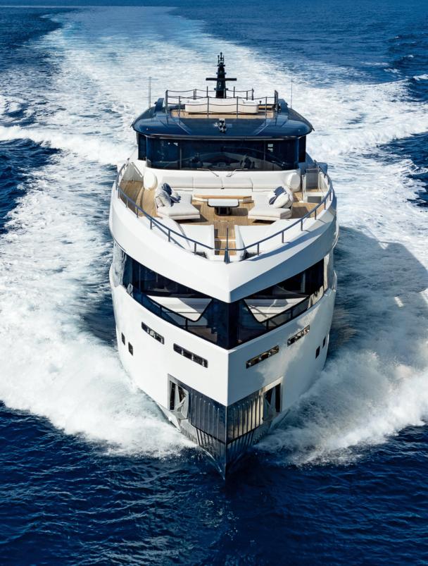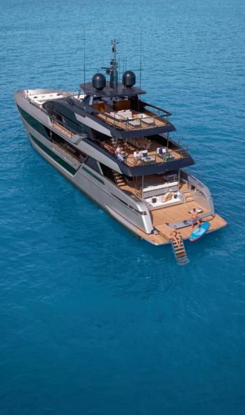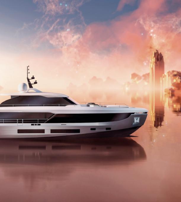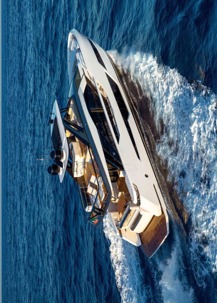 Custom Line Saetta 128 is the new made-tomeasure prototype in the Saetta line, which embraces all the brand's planing yachts. A tri-deck yacht with a dynamic and sporty profile, she is currently under construction and her launch and delivery are planned for 2026. She features new exterior styling by SY Design and interior design by ACPV ARCHITECTS Antonio Citterio Patricia Viel, with strategic consulting from Custom Line Atelier, as well as offering generous spaces characterised bytop-tier comfort and refinementonayachtwithalengthoverallof39.80 m, a maximum beam of 7.69 m and a planing hullunder 300 GT. Designedto maximise on-board liveability, the yacht optimises the distribution of space across all the decks, combining aesthetics and functionality. Equipped with two 2,638 hp MTU D13 M96L engines, she reaches a top speed of22 knots and a cruising speed of19 knots.