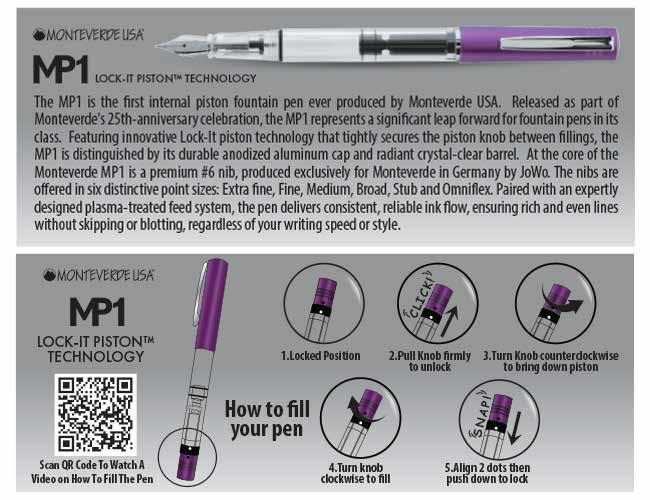 The MP1 is the first internal piston fountain pen ever produced by Monteverde USA. Released as part of Monteverde's 25th-anniversary celebration, the MP1 represents a significant leap forward for fountain pens in its