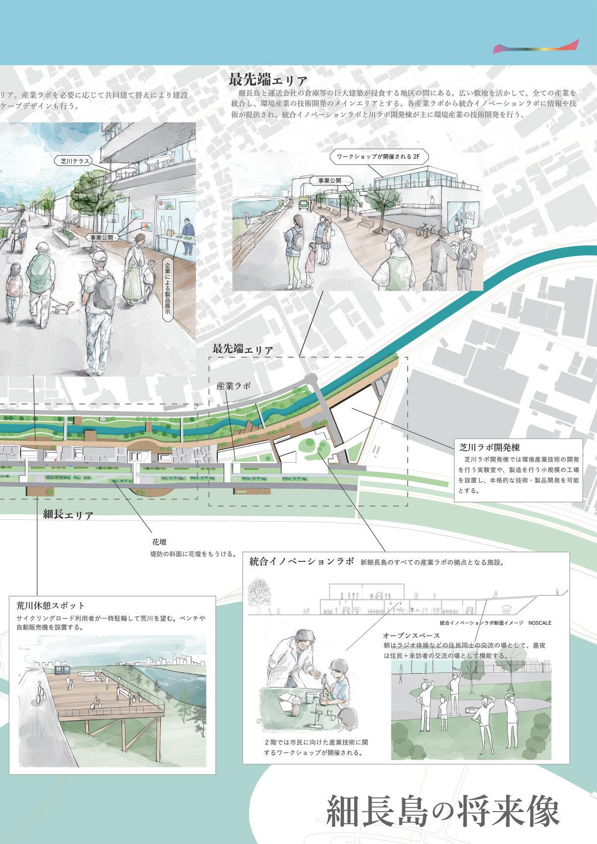 荒川と芝川に挟まれた細長い空間を「細長島」と名付け、 新たな環境産業を育て、発信する場所とする提案。産業 ラボ、川テラスなどを計画しながらも、芝川沿いの高低 差のあるランドスケープを改良し、長期的に芝川の水質 も改善していく提案である。