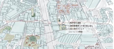 幹線道路にによって挟まれたヒューマンスケールの通りを題材に、普 通の何でもない日常の意味を問う。一見、訴求力が高く刺激的で新し い提案の対極にある「今あるもの」の体験を引き出し次代につなぐ提 案の難しさを共有した。「つくらない」をどうデザインするかの提案 だったとも言える。街路スケールの計画が周辺の大通りや商店街と呼 応(彼らはサンドイッチ理論と呼んでいた)することの関係性が重要 であること、日常に肉体化されるまでの時間と共有体験の重要性を学 ぶ機会にもなった。