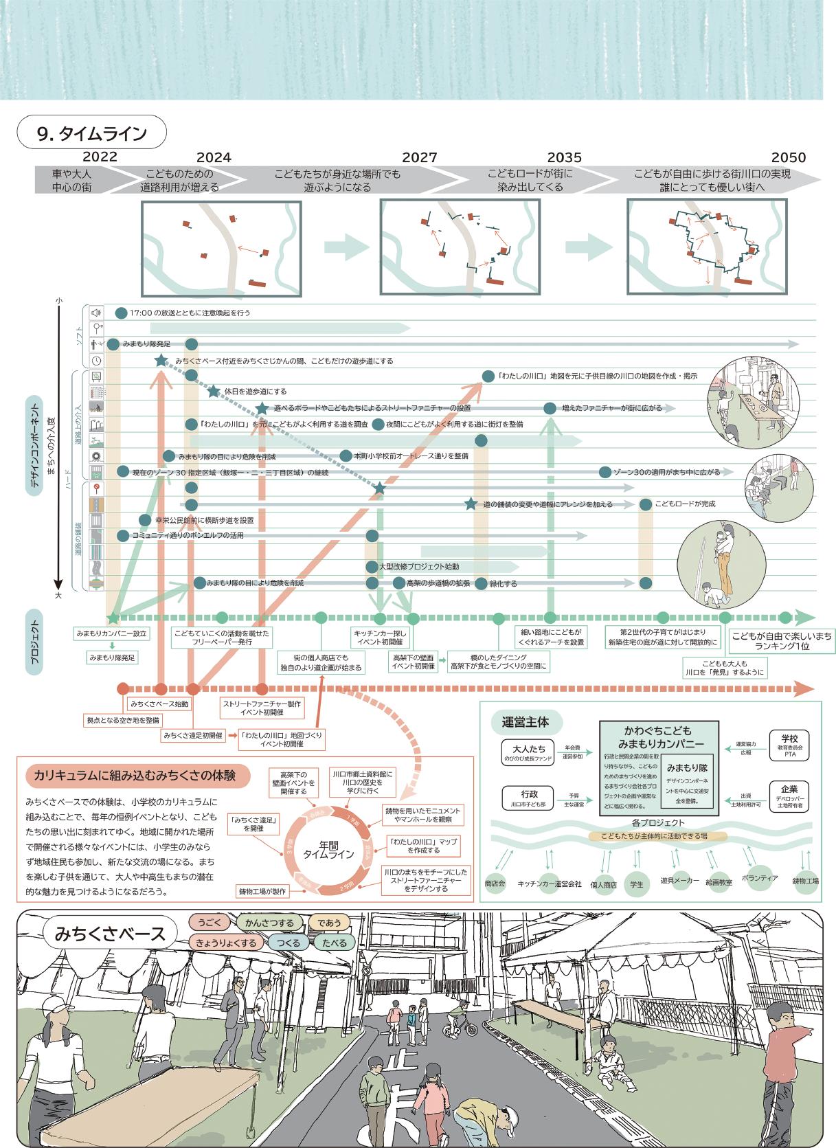 川口にはこどもの遊びと安全に配慮した環境が整ってい ないことに着目。こどもにとって本当に住みよいまちを 目指し、川口駅周辺の5つの小学校を結ぶ「こどもロー ド」の提案と、その周辺環境整備の指針を示すことで、 こどもたちが愛着を抱き続けるまちを構想する。
