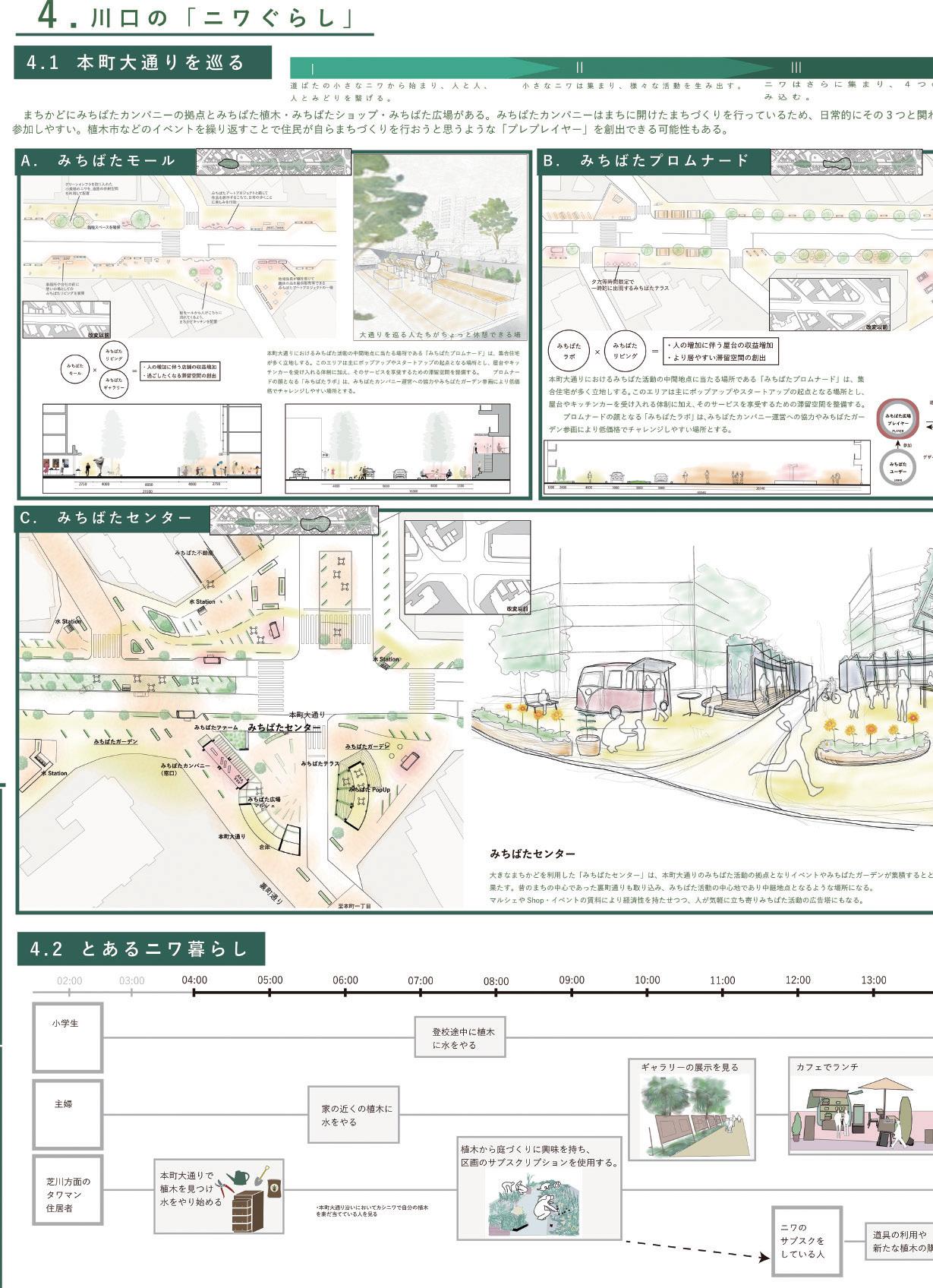 川口市の栄町に位置し、東西に真っすぐ伸びる四間道路 に可能性を見出し、そこが大通りに挟まれた「サンドイッ チエリア」であり、プライベートなコミュニティが育ま れていると指摘。四間通り沿いに工夫を埋め込むことに より、川口の緩衝地帯として育てる提案。